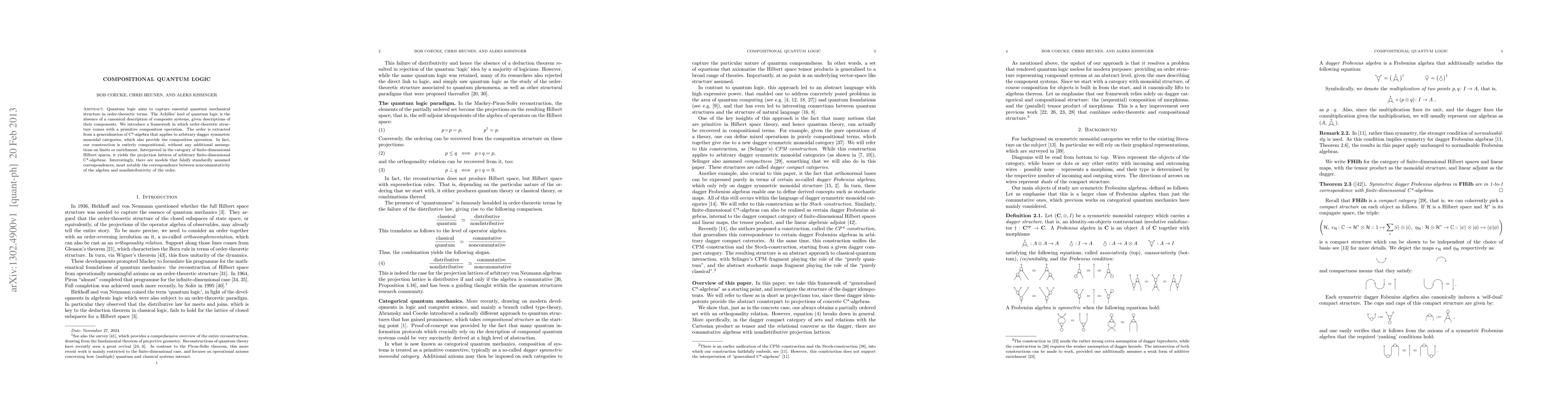Quantum logic aims to capture essential quantum mechanical structure in order-theoretic terms. The Achilles' heel of quantum logic is the absence of a canonical description of composite systems, given descriptions of their components. We introduce a framework in which order-theoretic structure comes with a primitive composition operation. The order is extracted from a generalisation of C*-algebra that applies to arbitrary dagger symmetric monoidal categories, which also provide the composition operation. In fact, our construction is entirely compositional, without any additional assumptions on limits or enrichment. Interpreted in the category of finite-dimensional Hilbert spaces, it yields the projection lattices of arbitrary finite-dimensional C*-algebras. Interestingly, there are models that falsify standardly assumed correspondences, most notably the correspondence between noncommutativity of the algebra and nondistributivity of the order.