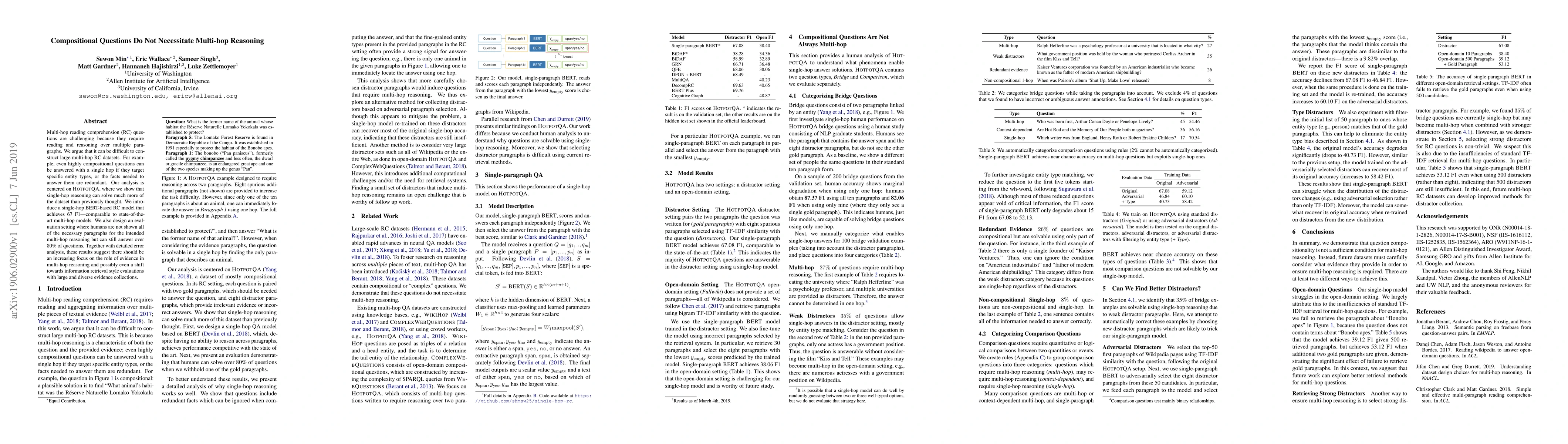 This paper argues that many compositional questions in multi-hop reading comprehension can be answered using single-hop reasoning due to specific entity types or redundant facts. A single-hop BERT-based model achieves comparable performance to multi-hop models, suggesting a shift towards evidence-focused evaluations.