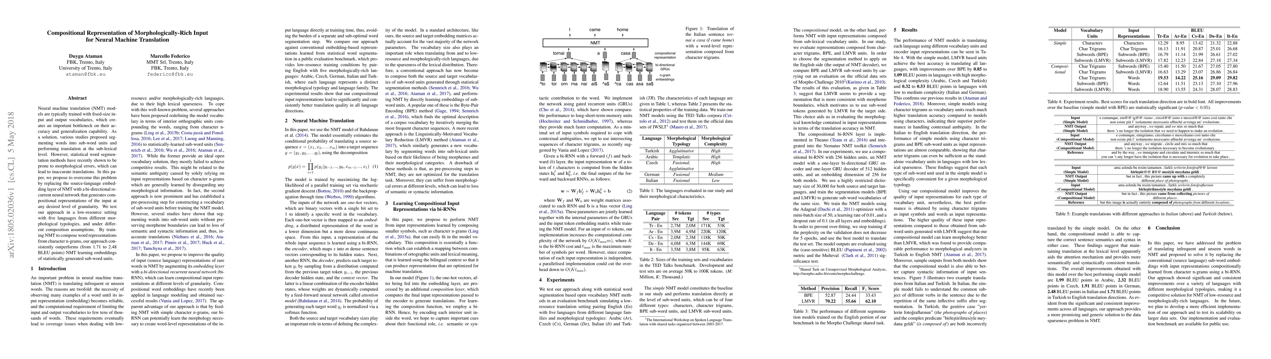 This paper proposes using a bi-directional RNN to generate compositional representations from character n-grams for neural machine translation, aiming to improve accuracy and generalization. Experimental results show consistent improvements over traditional sub-word unit embeddings, achieving higher BLEU scores across five low-resource languages.