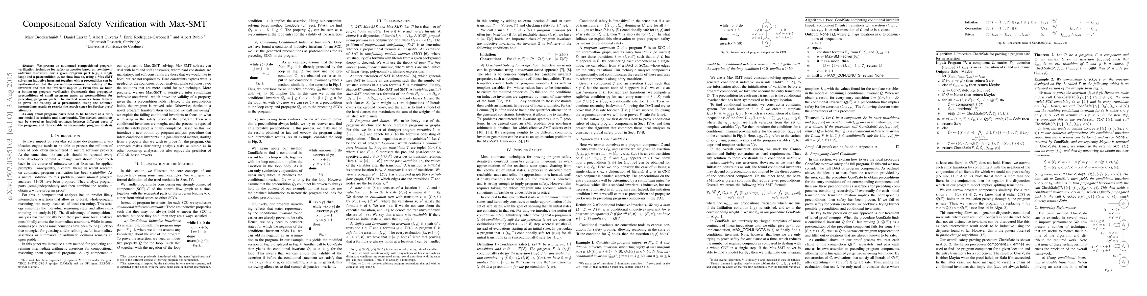 This paper introduces an automated compositional verification technique for safety properties using conditional inductive invariants and a Max-SMT solver. It constructs implicit contracts between program parts to enable scalable, incremental program analysis and recovery from verification failures.