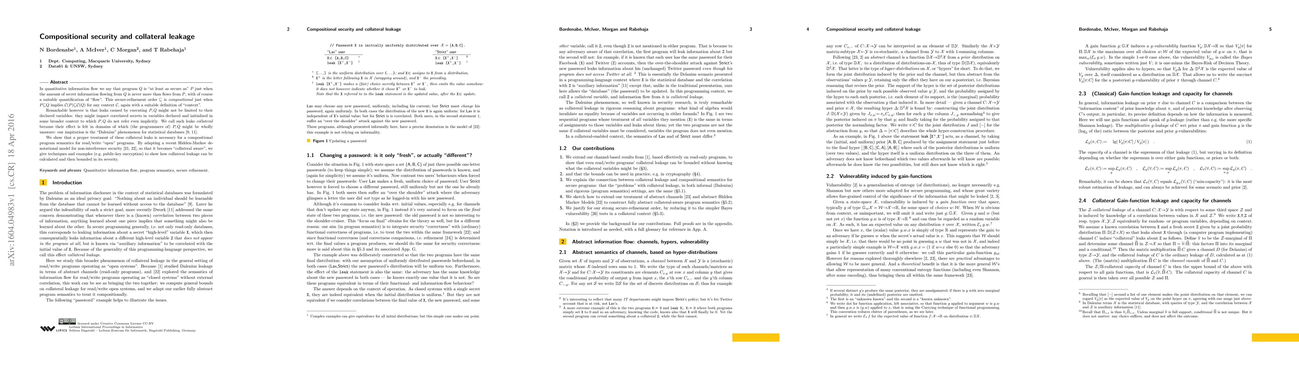 In quantitative information flow we say that program $Q$ is "at least as secure as" $P$ just when the amount of secret information flowing from $Q$ is never more than flows from $P$, with of course a suitable quantification of "flow". This secure-refinement order $\sqsubseteq$ is compositional just when $P{\sqsubseteq}Q$ implies ${\cal C}(P){\sqsubseteq}{\cal C}(Q)$ for any context ${\cal C}$, again with a suitable definition of "context". Remarkable however is that leaks caused by executing $P,Q$ might not be limited to their declared variables: they might impact correlated secrets in variables declared and initialised in some broader context to which $P,Q$ do not refer even implicitly. We call such leaks collateral because their effect is felt in domains of which (the programmers of) $P, Q$ might be wholly unaware: our inspiration is the "Dalenius" phenomenon for statistical databases. We show that a proper treatment of these collateral leaks is necessary for a compositional program semantics for read/write "open" programs. By adapting a recent Hidden-Markov denotational model for non-interference security, so that it becomes "collateral aware", we give techniques and examples (e.g.\ public-key encryption) to show how collateral leakage can be calculated and then bounded in its severity.