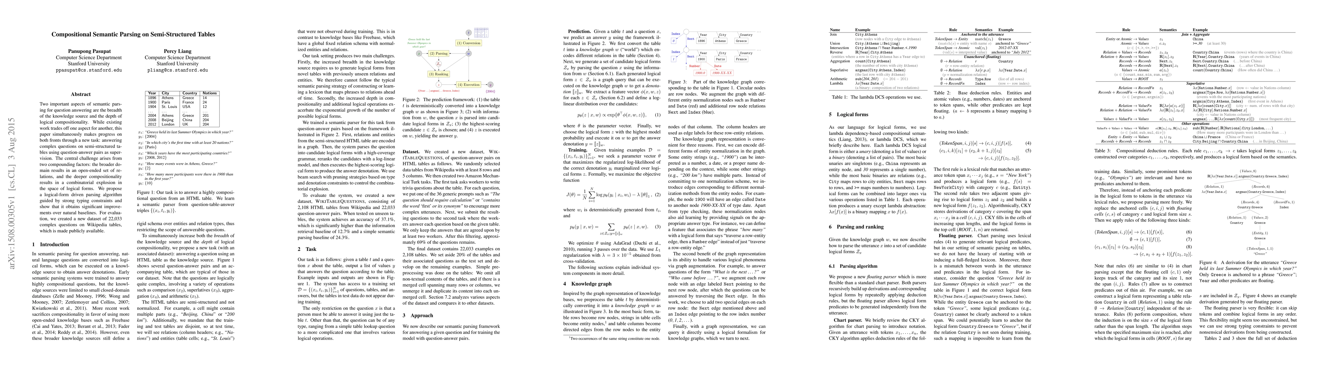 This paper introduces a novel approach to semantic parsing for answering complex questions on semi-structured tables, achieving both broader knowledge source coverage and deeper logical compositionality. The proposed logical-form driven parsing algorithm, guided by strong typing constraints, significantly outperforms natural baselines, as demonstrated on a new dataset of 22,033 complex questions on Wikipedia tables.