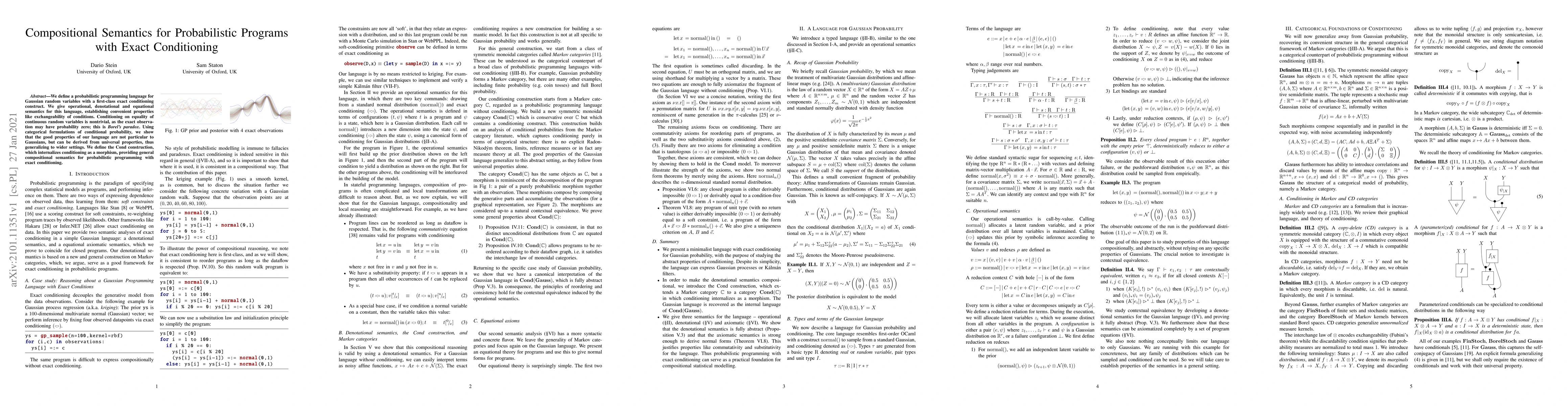 This paper introduces a probabilistic programming language for Gaussian random variables with exact conditioning, providing operational, denotational, and equational semantics. It addresses Borel's paradox and generalizes the language's properties through categorical formulations, defining the Cond construction to offer compositional semantics for exact conditioning in broader settings.
