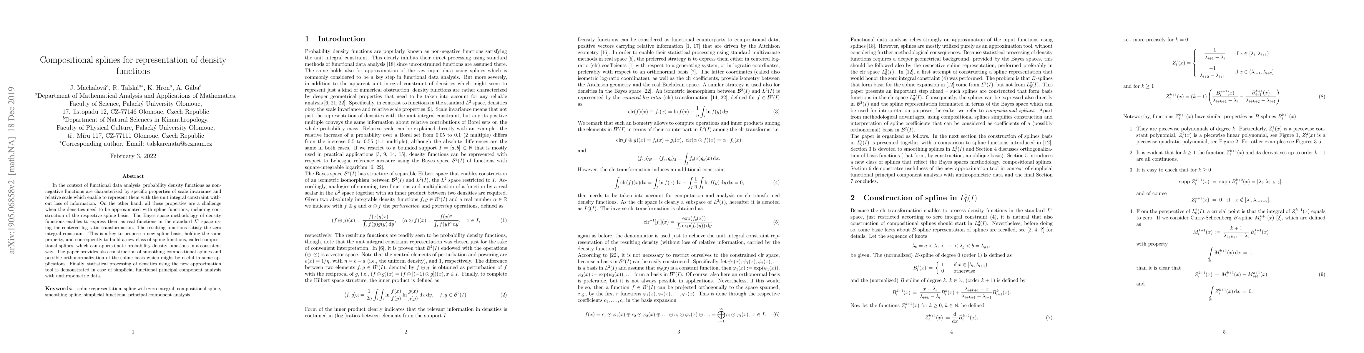 This paper introduces compositional splines for approximating probability density functions, leveraging the Bayes space methodology to construct a spline basis that maintains the unit integral constraint. The proposed compositional splines are demonstrated through smoothing and orthonormalization, and their application is showcased in simplicial functional principal component analysis using anthropometric data.