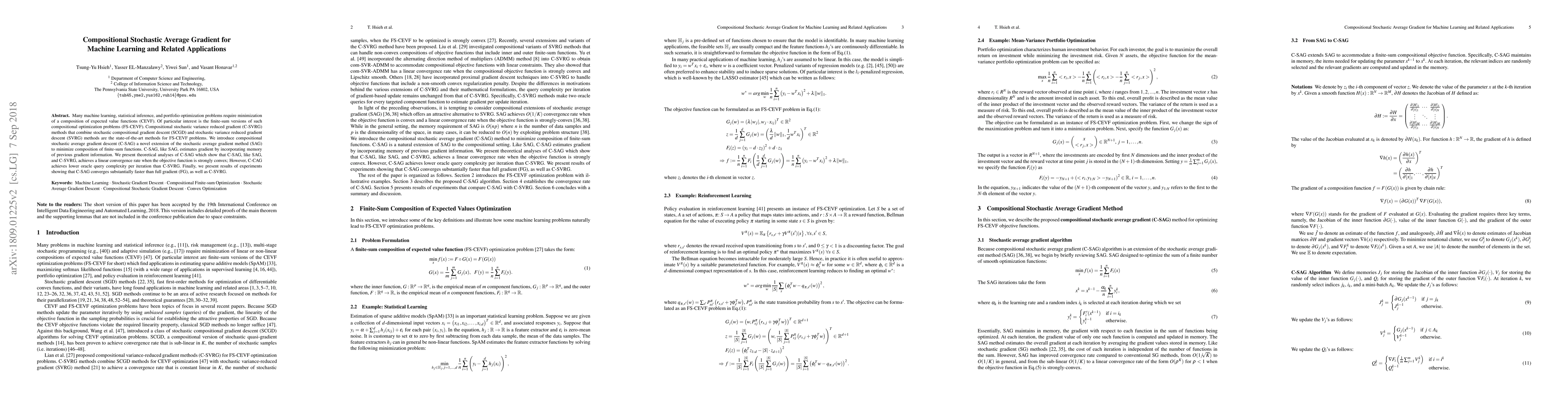 This paper introduces compositional stochastic average gradient descent (C-SAG) for minimizing composition of finite-sum functions, extending the stochastic average gradient method. Theoretical analyses show C-SAG achieves linear convergence and lower oracle query complexity compared to C-SVRG, with experimental results demonstrating faster convergence than full gradient and C-SVRG methods.
