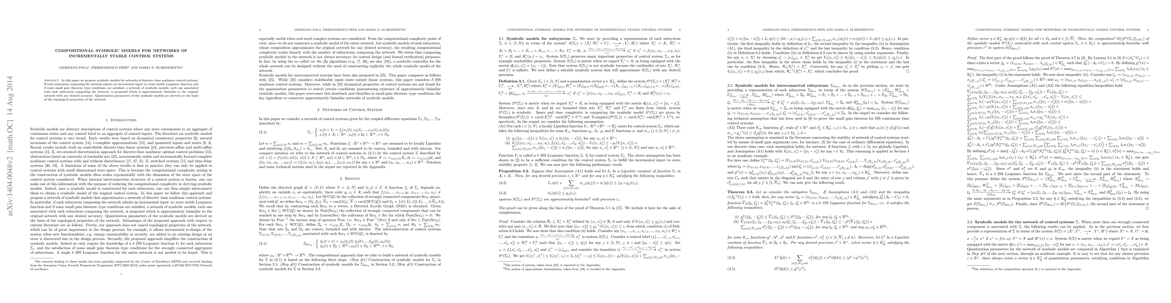 This paper constructs symbolic models for networks of incrementally stable control systems, demonstrating that under certain conditions, these models can approximate the original systems with desired accuracy through approximate bisimulation. It also presents a compositional method for determining the quantization parameters based on the network's topology.