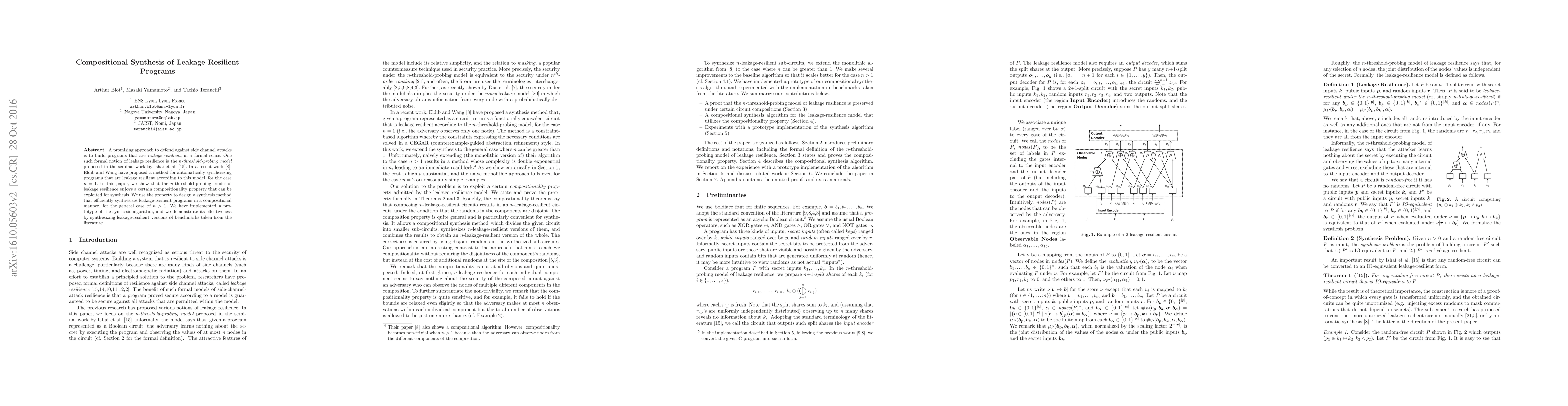 This paper presents a method for synthesizing leakage-resilient programs using the n-threshold-probing model, demonstrating a compositionality property that allows efficient synthesis for n > 1. The authors implement a prototype and show its effectiveness through benchmark examples.