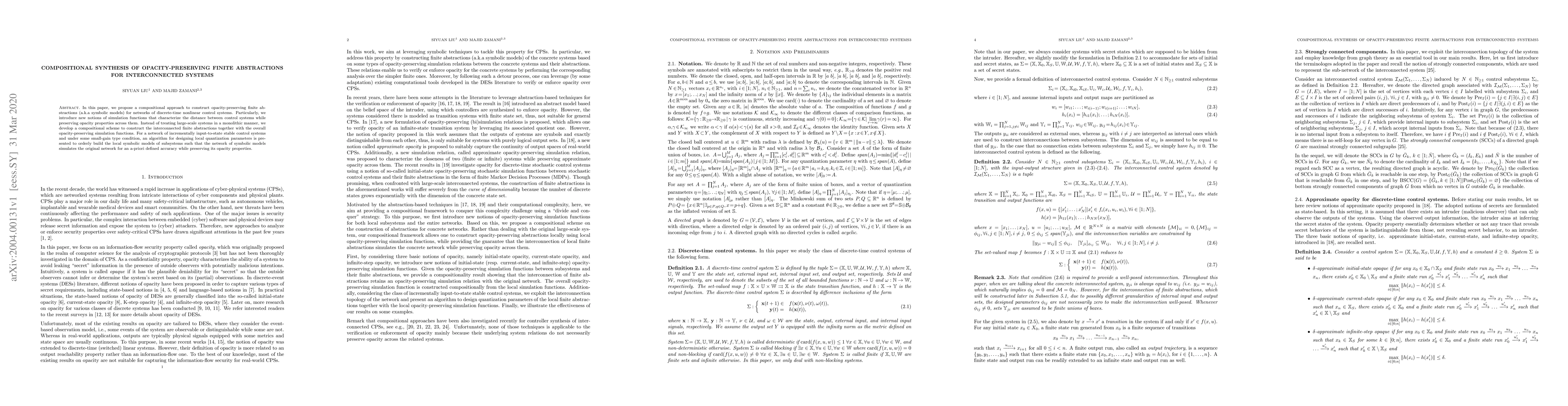 This paper proposes a compositional method for creating opacity-preserving finite abstractions for interconnected nonlinear control systems. It introduces new simulation functions to maintain opacity properties across subsystems, presenting an algorithm for local quantization parameters to build local symbolic models that simulate the original network accurately.