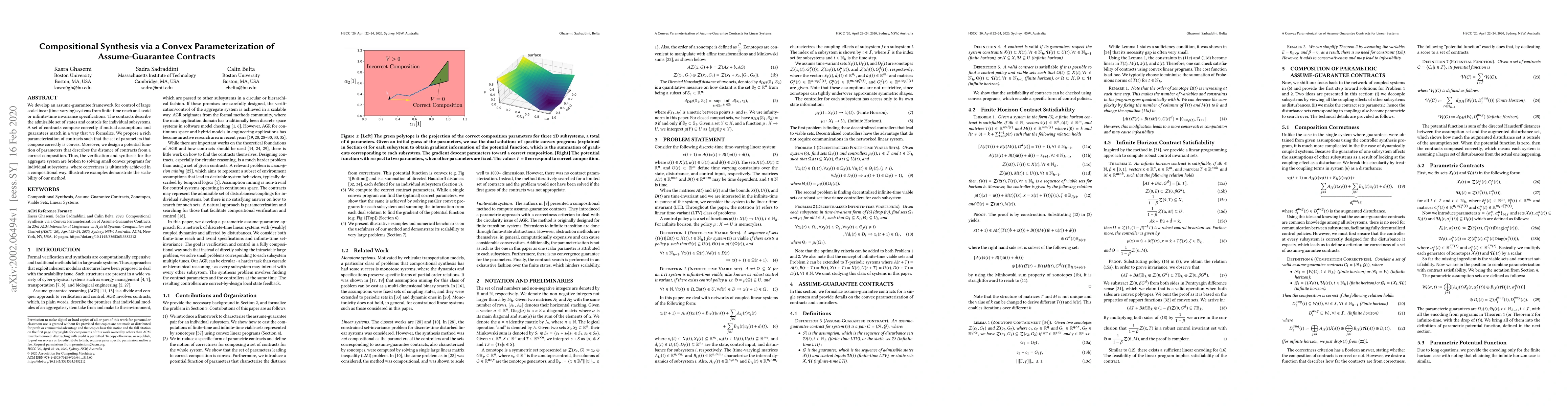 This paper proposes a convex parameterization for assume-guarantee contracts to facilitate compositional synthesis of large-scale linear systems. The method ensures correct composition through a formal matching of assumptions and guarantees, enabling scalable verification and synthesis via convex optimization.