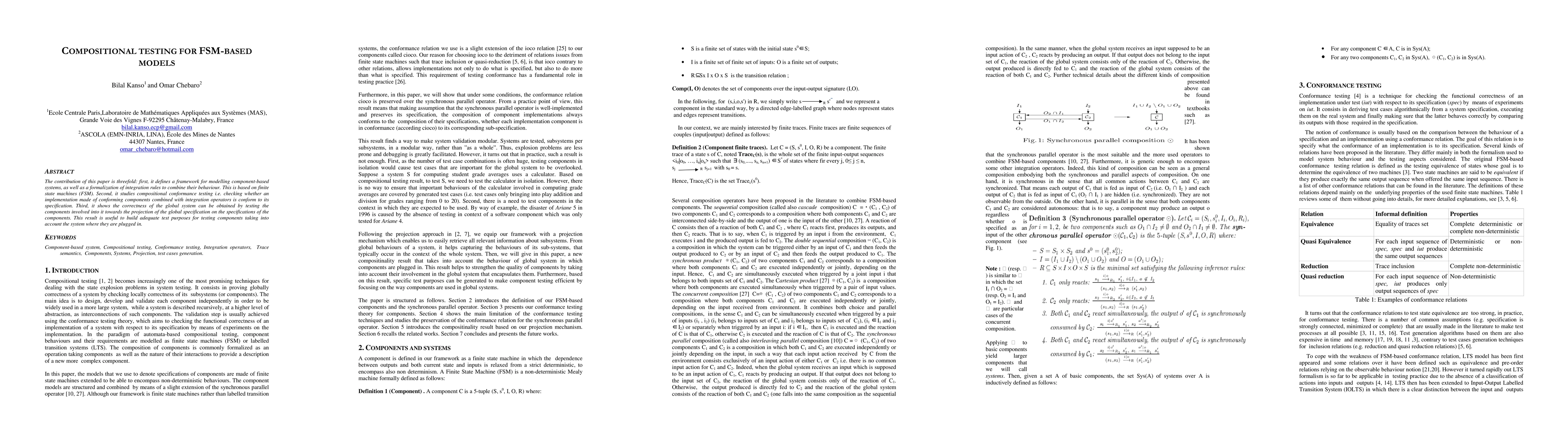This paper presents a framework for modelling component-based systems using finite state machines and formalizes integration rules for combining their behavior. It also explores compositional conformance testing to verify the integration of conforming components and demonstrates the correctness of the global system through component testing.