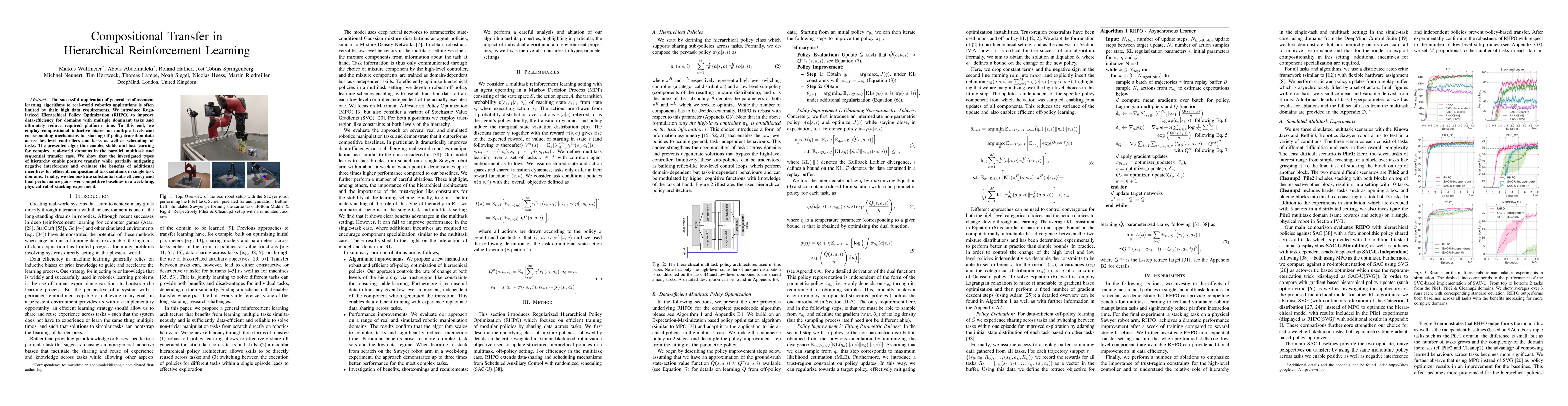 The successful application of general reinforcement learning algorithms to real-world robotics applications is often limited by their high data requirements. We introduce Regularized Hierarchical Policy Optimization (RHPO) to improve data-efficiency for domains with multiple dominant tasks and ultimately reduce required platform time. To this end, we employ compositional inductive biases on multiple levels and corresponding mechanisms for sharing off-policy transition data across low-level controllers and tasks as well as scheduling of tasks. The presented algorithm enables stable and fast learning for complex, real-world domains in the parallel multitask and sequential transfer case. We show that the investigated types of hierarchy enable positive transfer while partially mitigating negative interference and evaluate the benefits of additional incentives for efficient, compositional task solutions in single task domains. Finally, we demonstrate substantial data-efficiency and final performance gains over competitive baselines in a week-long, physical robot stacking experiment.