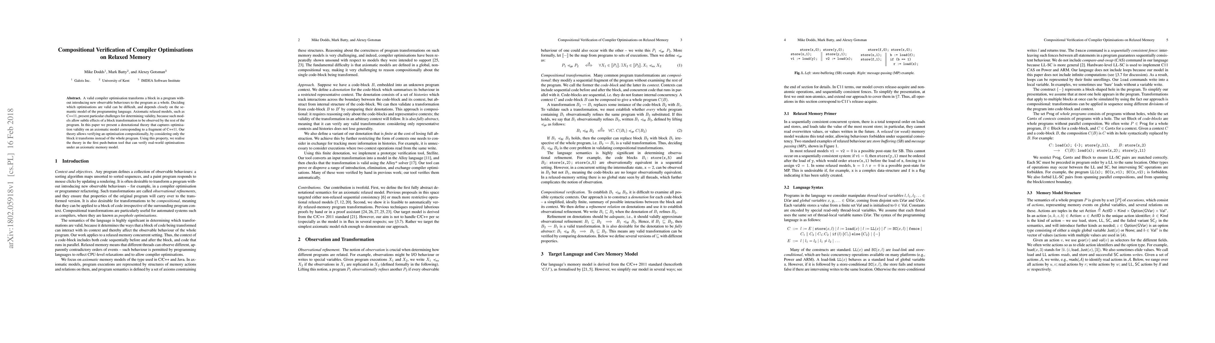 This paper proposes a denotational theory to verify compiler optimisations' validity under a relaxed memory model, specifically a fragment of C++11. The theory enables compositional verification of optimisations, allowing real-world optimisations to be verified with a new push-button tool.
