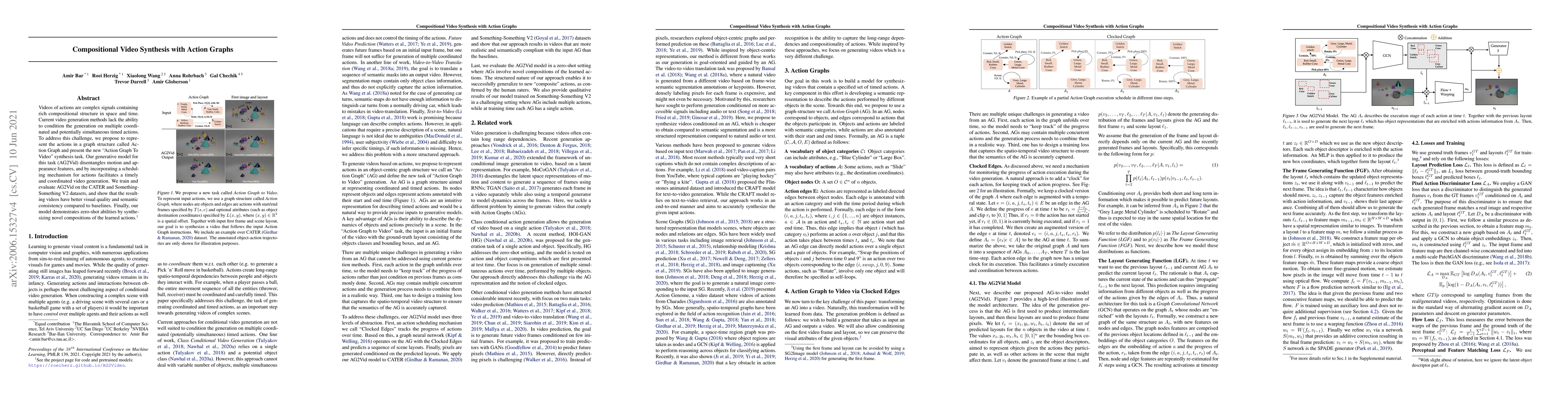This paper proposes a novel "Action Graph To Video" synthesis method (AG2Vid) that represents actions in a graph structure to generate videos with coordinated and simultaneous actions. The model disentangles motion and appearance features and shows improved visual quality and semantic consistency over baselines on CATER and Something-Something V2 datasets.