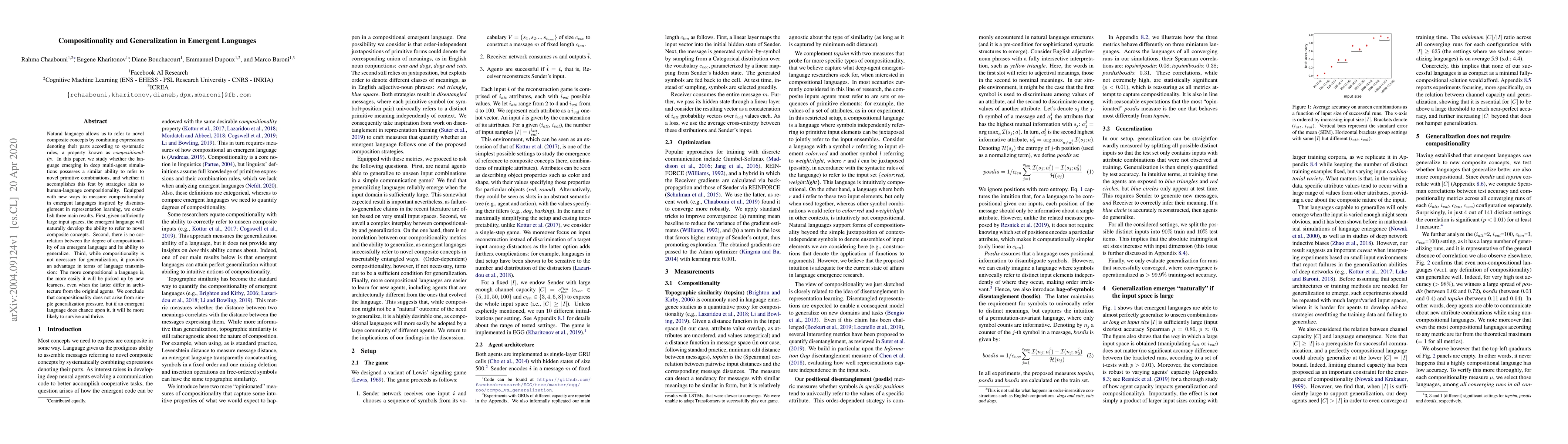 This paper investigates whether emergent languages in deep multi-agent simulations exhibit compositionality and its role in generalization. It finds that large input spaces lead to emergent languages that can refer to novel composite concepts, but compositionality does not correlate with generalization ability. However, more compositional languages are easier for new learners to acquire.