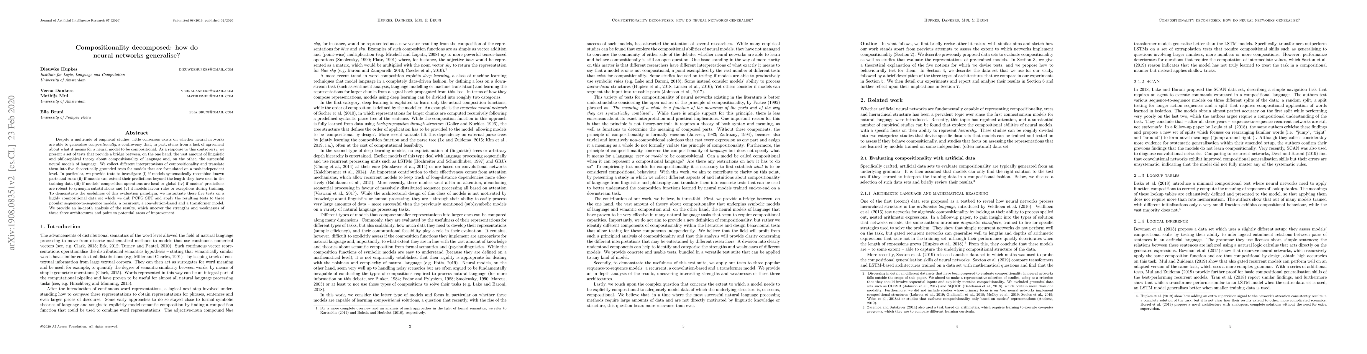 This paper proposes a set of five tests to evaluate the compositional generalisation abilities of neural networks, bridging linguistic theory and neural models. It applies these tests to three sequence-to-sequence models on a compositional dataset, revealing their strengths and weaknesses in compositionality.