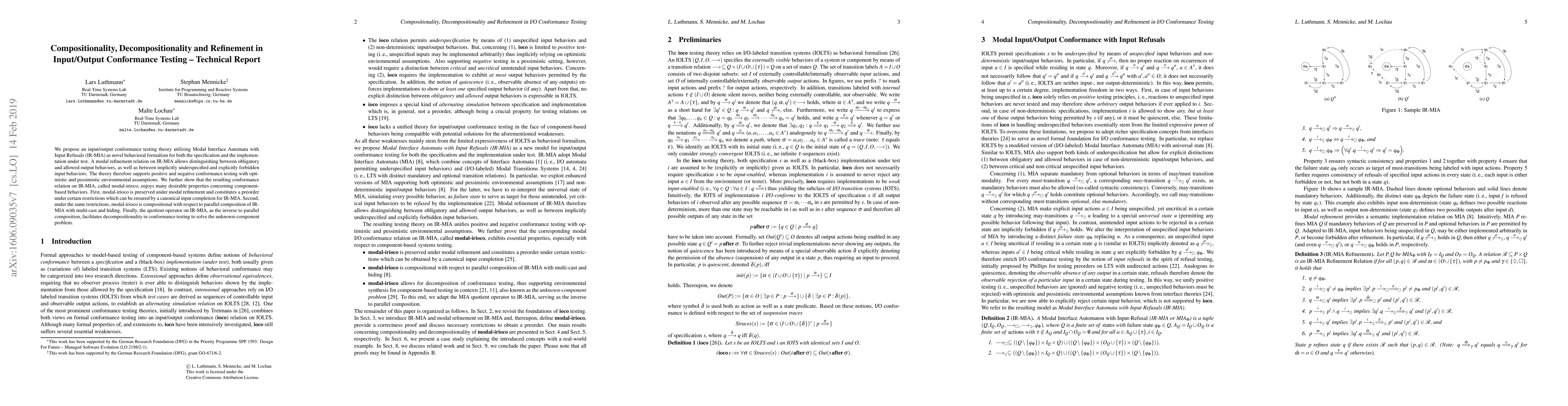 This paper proposes a novel input/output conformance testing theory using Modal Interface Automata with Input Refusals (IR-MIA) to specify and test implementations. The theory supports both positive and negative conformance testing and is compositional, decomposable, and preserves refinement relations.
