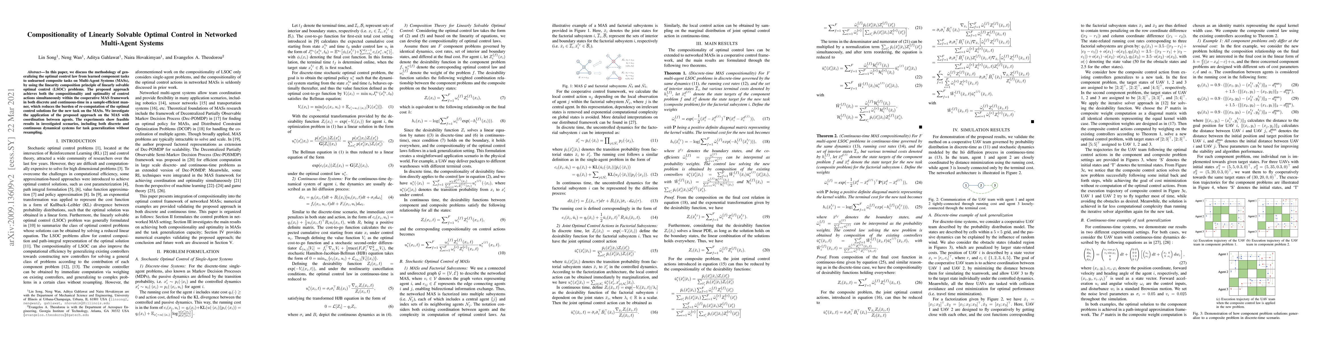 This paper proposes a method to generalize optimal control laws in Multi-Agent Systems (MASs) using the linearity composition principle of linearly solvable optimal control (LSOC) problems, achieving both compositionality and optimality in a sample-efficient manner. Experiments demonstrate the feasibility of the approach in both discrete and continuous dynamical systems for task generalization without resampling.