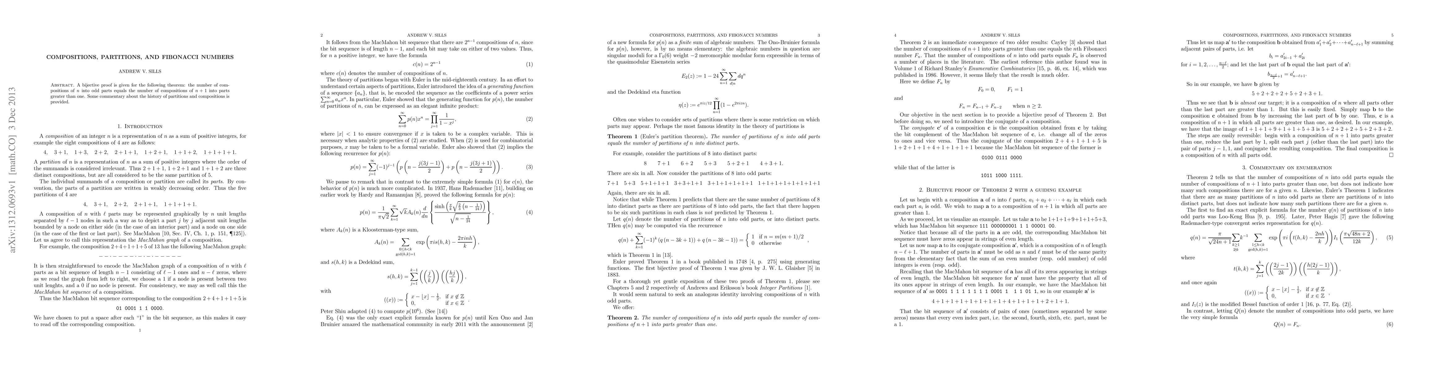This paper presents a bijective proof showing that the number of compositions of n into odd parts is equal to the number of compositions of n + 1 into parts greater than one, with a brief historical overview of partitions and compositions.
