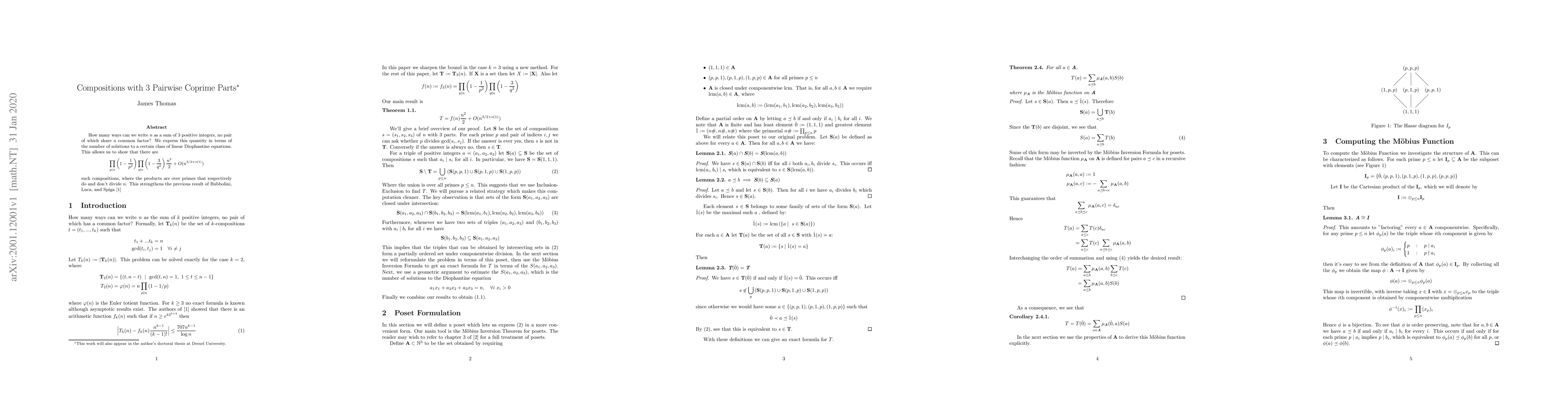 How many ways can we write $n$ as a sum of $3$ positive integers, no pair of which share a common factor? We express this quantity in terms of the number of solutions to a certain class of linear Diophantine equations. This allows us to show that there are $$ \prod_{p \mid n} \left( 1- \frac{1}{p^2} \right) \prod_{q \nmid n} \left( 1- \frac{3}{q^2} \right) \frac{n^2}{2} + O(n^{3/2+o(1)}) $$ such compositions, where the products are over primes that respectively do and don't divide $n$. This strengthens the previous result of Bubbolini, Luca, and Spiga (arXiv:1202.1670)