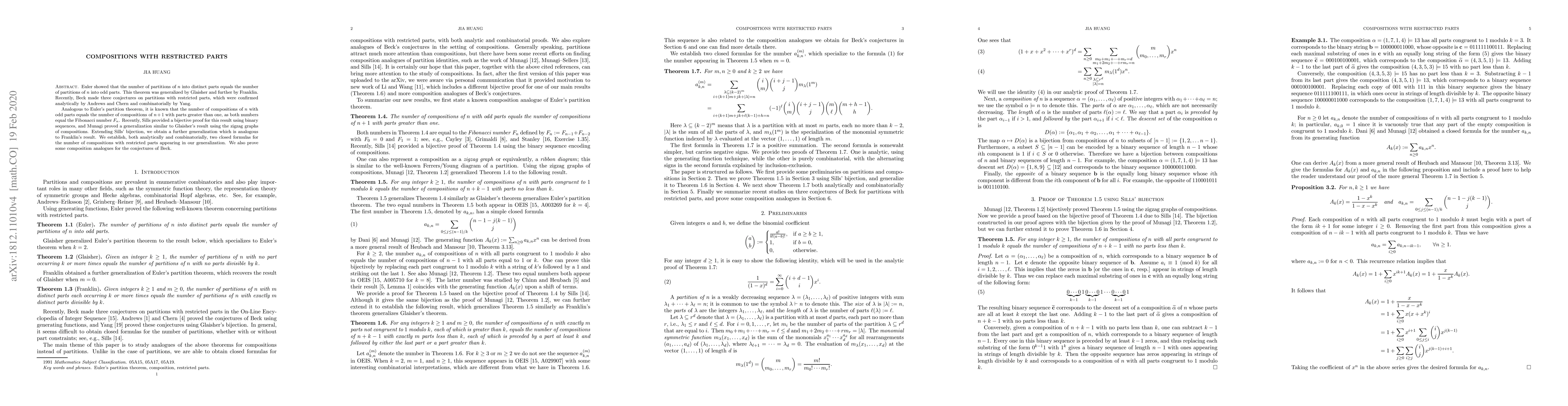 Euler showed that the number of partitions of $n$ into distinct parts equals the number of partitions of $n$ into odd parts. This theorem was generalized by Glaisher and further by Franklin. Recently, Beck made three conjectures on partitions with restricted parts, which were confirmed analytically by Andrews and Chern and combinatorially by Yang. Analogous to Euler's partition theorem, it is known that the number of compositions of $n$ with odd parts equals the number of compositions of $n+1$ with parts greater than one, as both numbers equal the Fibonacci number $F_n$. Recently, Sills provided a bijective proof for this result using binary sequences, and Munagi proved a generalization similar to Glaisher's result using the zigzag graphs of compositions. Extending Sills' bijection, we obtain a further generalizaiton which is analogous to Franklin's result. We establish, both analytically and combinatorially, two closed formulas for the number of compositions with restricted parts appearing in our generalization. We also prove some composition analogues for the conjectures of Beck.