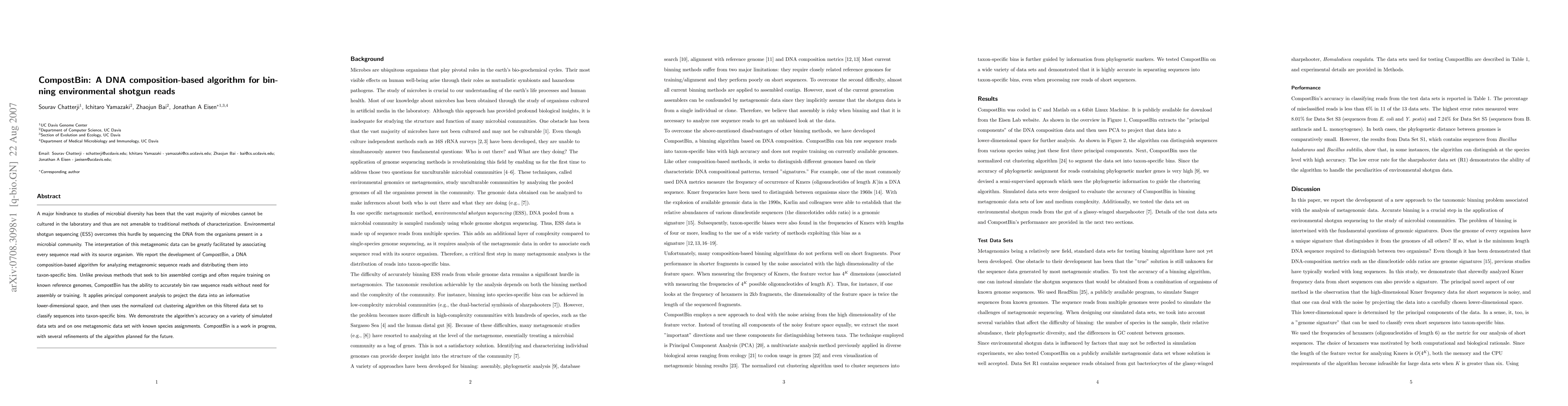 A major hindrance to studies of microbial diversity has been that the vast majority of microbes cannot be cultured in the laboratory and thus are not amenable to traditional methods of characterization. Environmental shotgun sequencing (ESS) overcomes this hurdle by sequencing the DNA from the organisms present in a microbial community. The interpretation of this metagenomic data can be greatly facilitated by associating every sequence read with its source organism. We report the development of CompostBin, a DNA composition-based algorithm for analyzing metagenomic sequence reads and distributing them into taxon-specific bins. Unlike previous methods that seek to bin assembled contigs and often require training on known reference genomes, CompostBin has the ability to accurately bin raw sequence reads without need for assembly or training. It applies principal component analysis to project the data into an informative lower-dimensional space, and then uses the normalized cut clustering algorithm on this filtered data set to classify sequences into taxon-specific bins. We demonstrate the algorithm's accuracy on a variety of simulated data sets and on one metagenomic data set with known species assignments. CompostBin is a work in progress, with several refinements of the algorithm planned for the future.