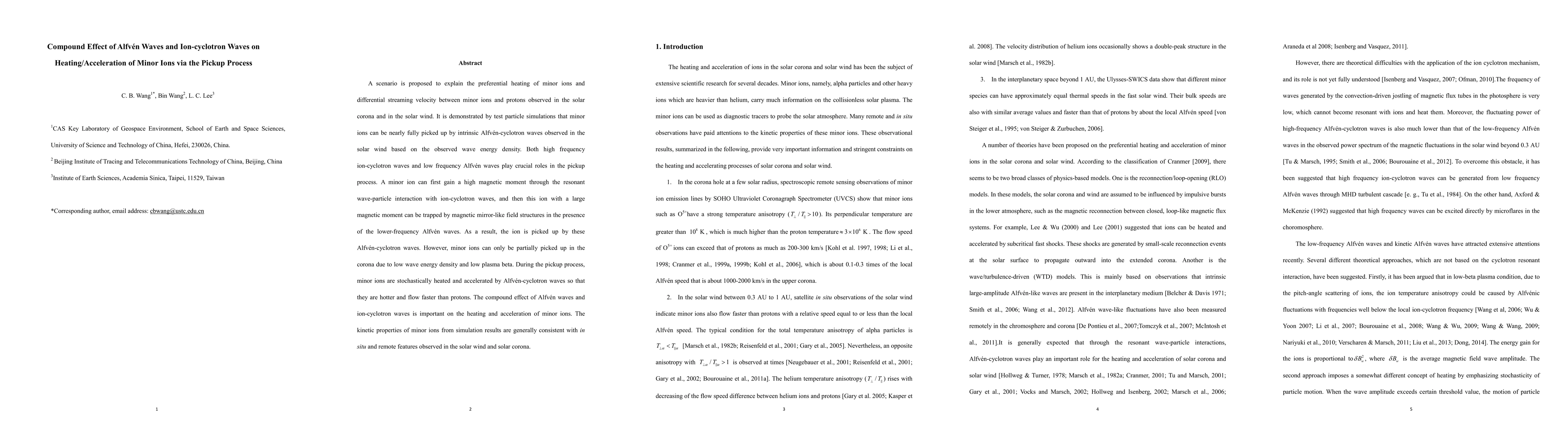 A scenario is proposed to explain the preferential heating of minor ions and differential streaming velocity between minor ions and protons observed in the solar corona and in the solar wind. It is demonstrated by test particle simulations that minor ions can be nearly fully picked up by intrinsic Alfv\'en-cyclotron waves observed in the solar wind based on the observed wave energy density. Both high frequency ion-cyclotron waves and low frequency Alfv\'en waves play crucial roles in the pickup process. A minor ion can first gain a high magnetic moment through the resonant wave-particle interaction with ion-cyclotron waves, and then this ion with a large magnetic moment can be trapped by magnetic mirror-like field structures in the presence of the lower-frequency Alfv\'en waves. As a result, the ion is picked up by these Alfv\'en-cyclotron waves. However, minor ions can only be partially picked up in the corona due to low wave energy density and low plasma beta. During the pickup process, minor ions are stochastically heated and accelerated by Alfv\'en-cyclotron waves so that they are hotter and flow faster than protons. The compound effect of Alfv\'en waves and ion-cyclotron waves is important on the heating and acceleration of minor ions. The kinetic properties of minor ions from simulation results are generally consistent with in situ and remote features observed in the solar wind and solar corona.