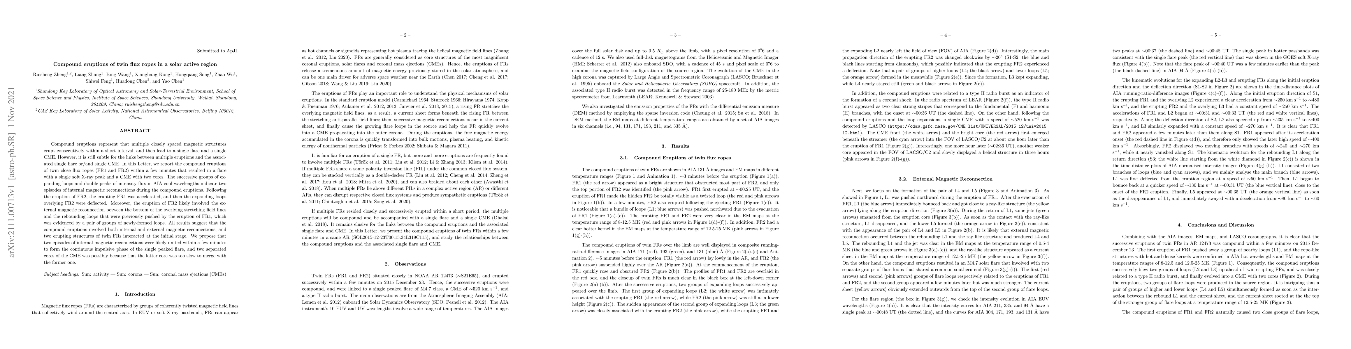 This paper investigates compound eruptions of twin flux ropes (FR1 and FR2) in a solar active region, revealing that both internal and external magnetic reconnections played roles in the process. The study shows that the eruptions resulted in a single flare and a CME with two cores, suggesting interactions between the twin flux ropes and the reconnection processes.