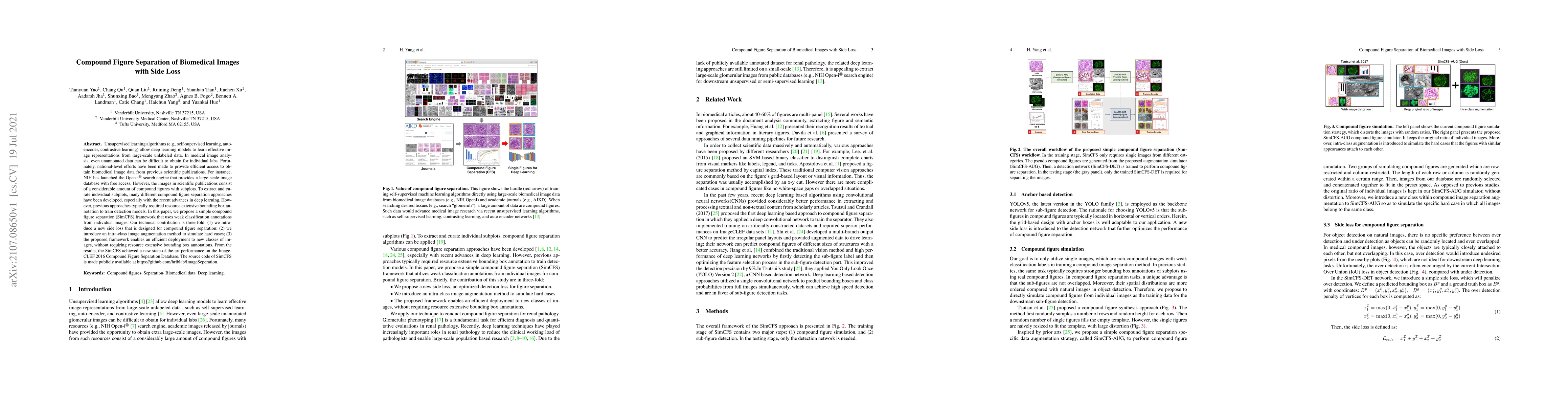 This paper proposes a novel SimCFS framework for separating compound figures in biomedical images using weak classification annotations instead of resource-intensive bounding box annotations. The framework introduces a new side loss and an intra-class augmentation method, achieving state-of-the-art performance on the ImageCLEF 2016 Compound Figure Separation Database.