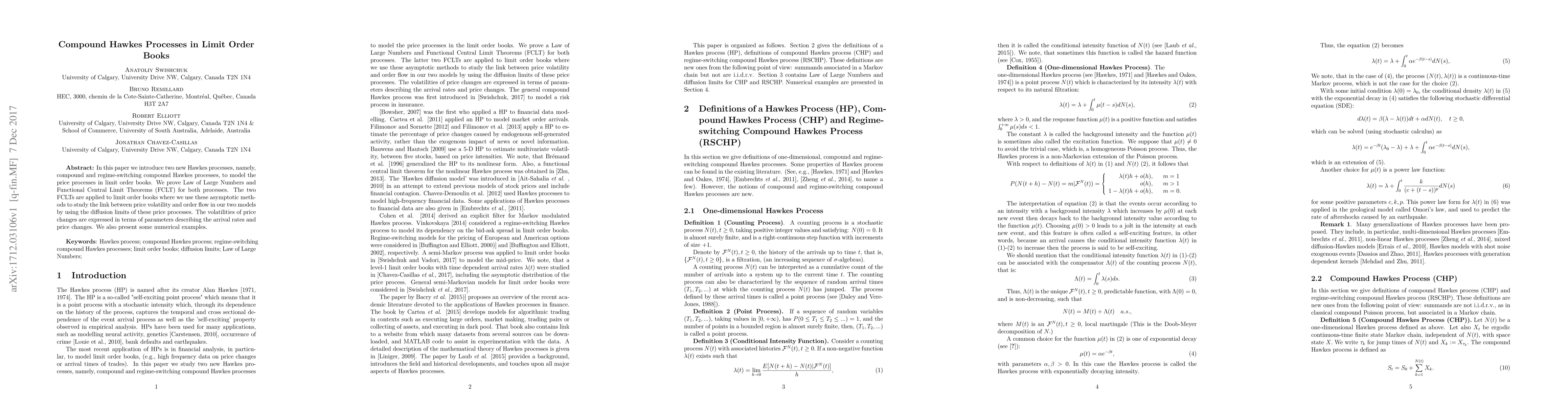 The paper introduces compound and regime-switching compound Hawkes processes to model price processes in limit order books, proving Law of Large Numbers (LLN) and Functional Central Limit Theorems (FCLT) for both processes. These asymptotic methods are applied to study the link between price volatility and order flow.