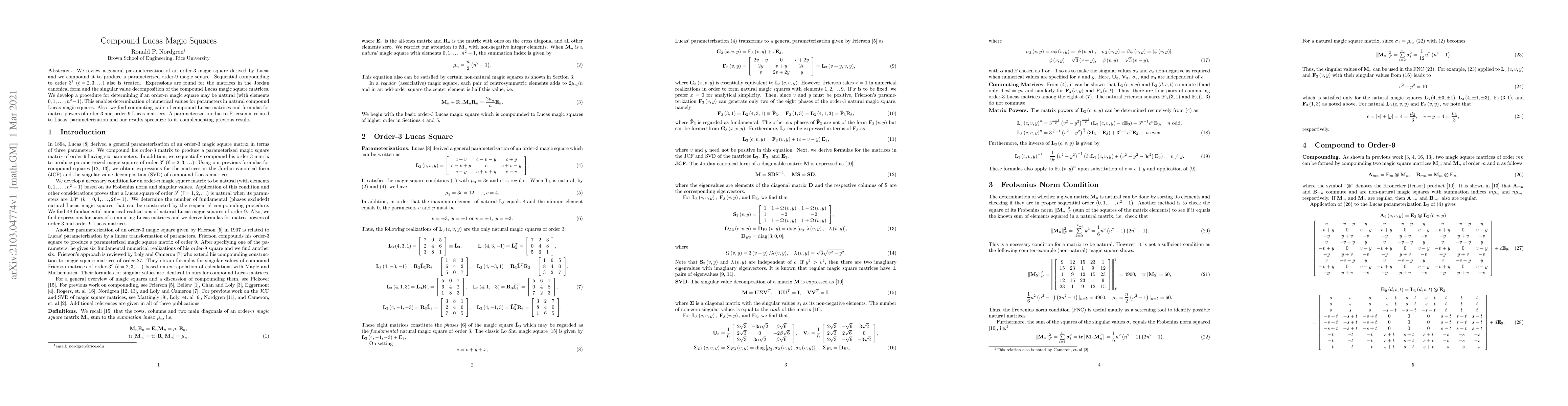 We review a general parameterization of an order-3 magic square derived by Lucas and we compound it to produce a parameterized order-9 magic square. Sequential compounding to higher order also is treated. Expressions are found for the matrices in the Jordan canonical form and the singular value decomposition of the compound Lucas magic square matrices. We develop a procedure for determining if an order-n magic square may be natural. This enables determination of numerical values for parameters in natural compound Lucas magic squares. Also, we find commuting pairs of compound Lucas matrices and formulas for matrix powers of order-3 and order-9 Lucas matrices. A parameterization due to Frierson is related to Lucas' parameterization and our results specialize to it, complementing previous results.