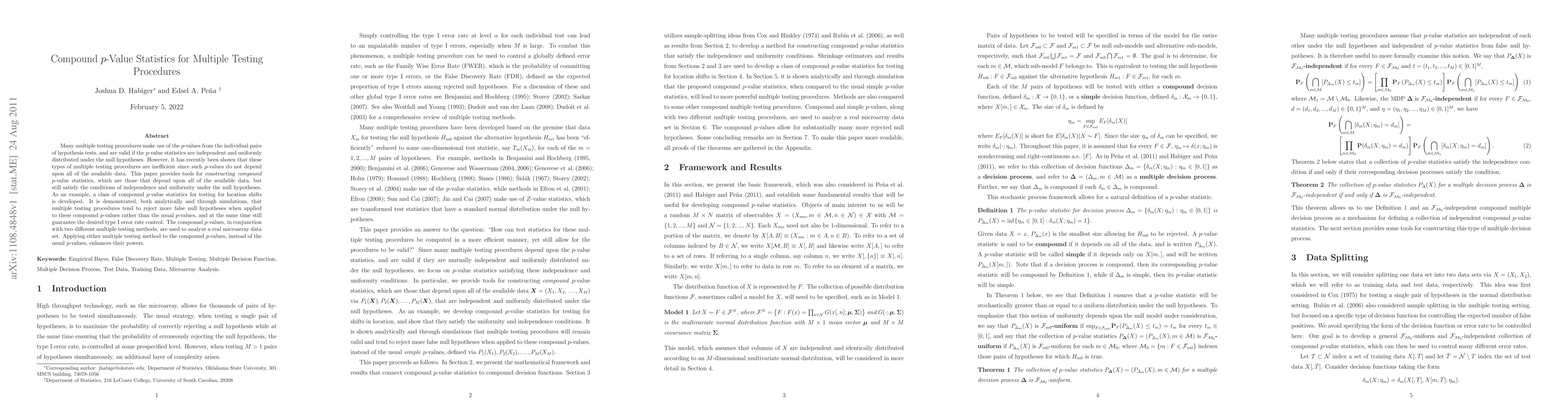 Many multiple testing procedures make use of the p-values from the individual pairs of hypothesis tests, and are valid if the p-value statistics are independent and uniformly distributed under the null hypotheses. However, it has recently been shown that these types of multiple testing procedures are inefficient since such p-values do not depend upon all of the available data. This paper provides tools for constructing compound p-value statistics, which are those that depend upon all of the available data, but still satisfy the conditions of independence and uniformity under the null hypotheses. As an example, a class of compound p-value statistics for testing for location shifts is developed. It is demonstrated, both analytically and through simulations, that multiple testing procedures tend to reject more false null hypotheses when applied to these compound p-values rather than the usual p-values, and at the same time still guarantee the desired type I error rate control. The compound p-values, in conjunction with two different multiple testing methods, are used to analyze a real microarray data set. Applying either multiple testing method to the compound p-values, instead of the usual p-values, enhances their powers.