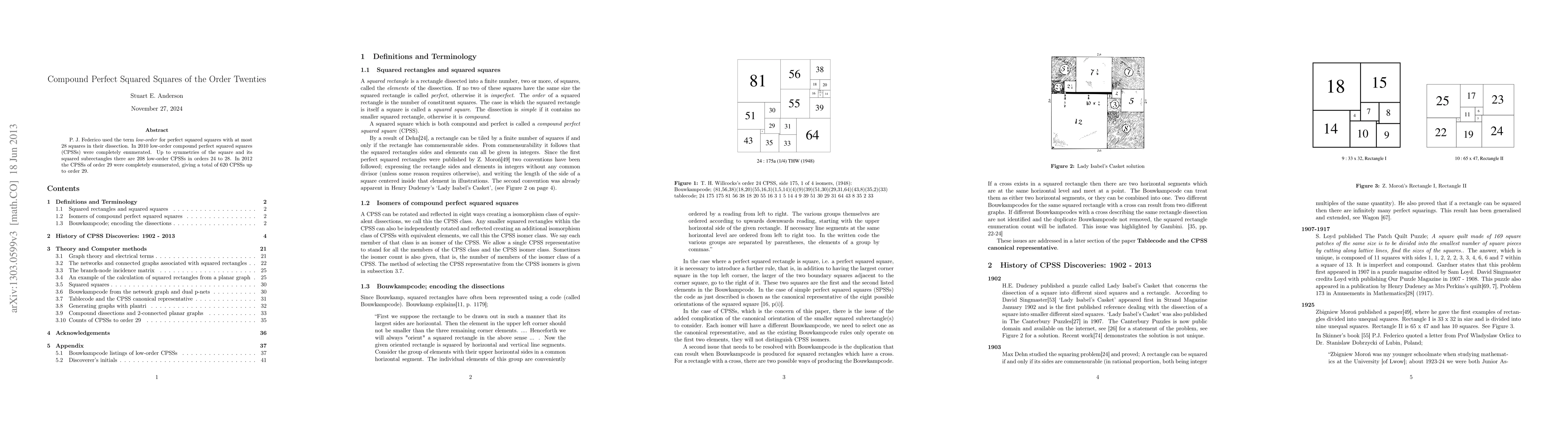P. J. Federico used the term low-order for perfect squared squares with at most 28 squares in their dissection. In 2010 low-order compound perfect squared squares (CPSSs) were completely enumerated. Up to symmetries of the square and its squared subrectangles there are 208 low-order CPSSs in orders 24 to 28. In 2012 the CPSSs of order 29 were completely enumerated, giving a total of 620 CPSSs up to order 29.