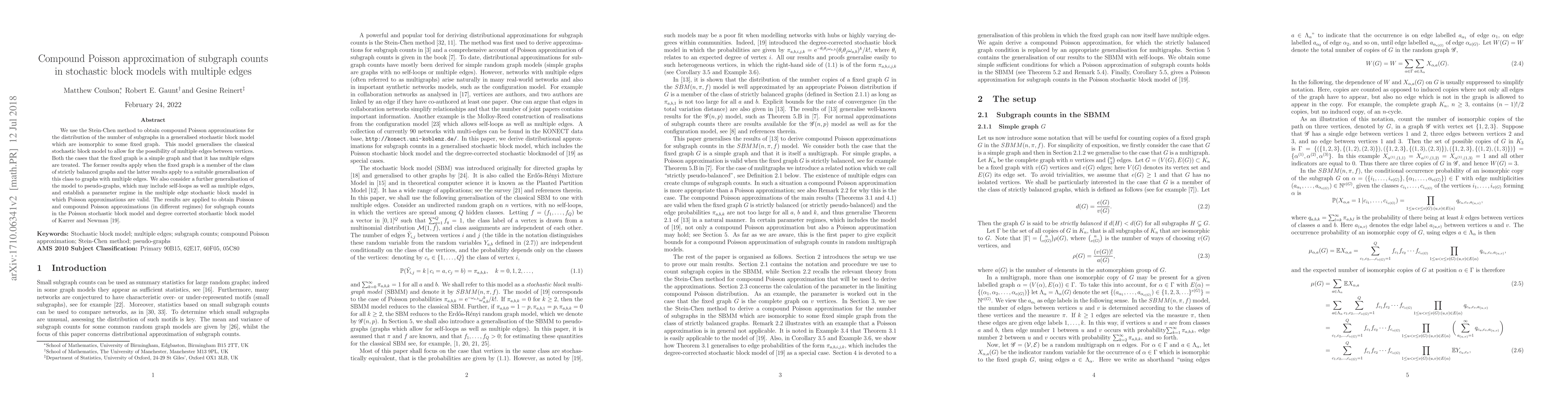 This paper uses the Stein-Chen method to derive compound Poisson approximations for subgraph counts in generalised stochastic block models that allow multiple edges. The study applies these approximations to both simple graphs and those with multiple edges, and extends the analysis to pseudo-graphs, establishing conditions under which Poisson approximations hold.