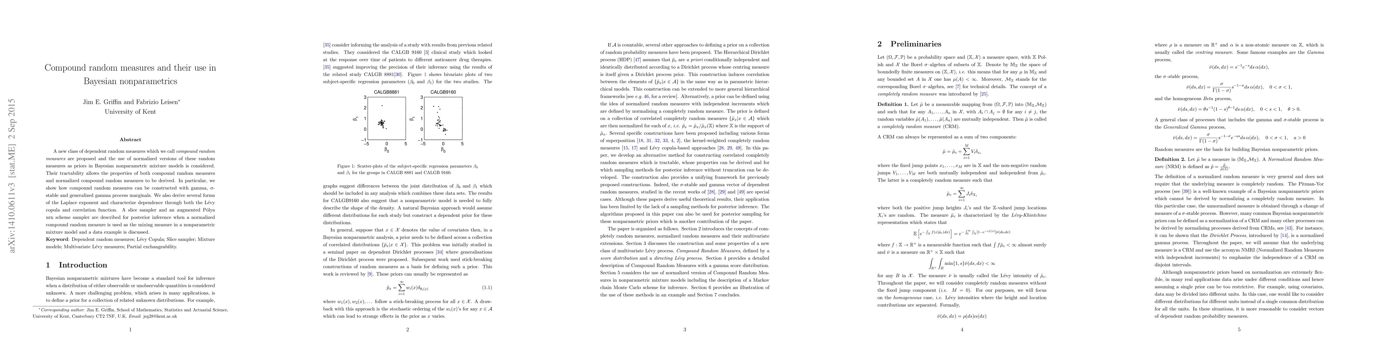 This paper introduces compound random measures, a new class of dependent random measures, and explores their application as priors in Bayesian nonparametric mixture models. The authors demonstrate the tractability of these measures, derive their properties, and propose methods for posterior inference using slice sampling and an augmented Pólya urn scheme.