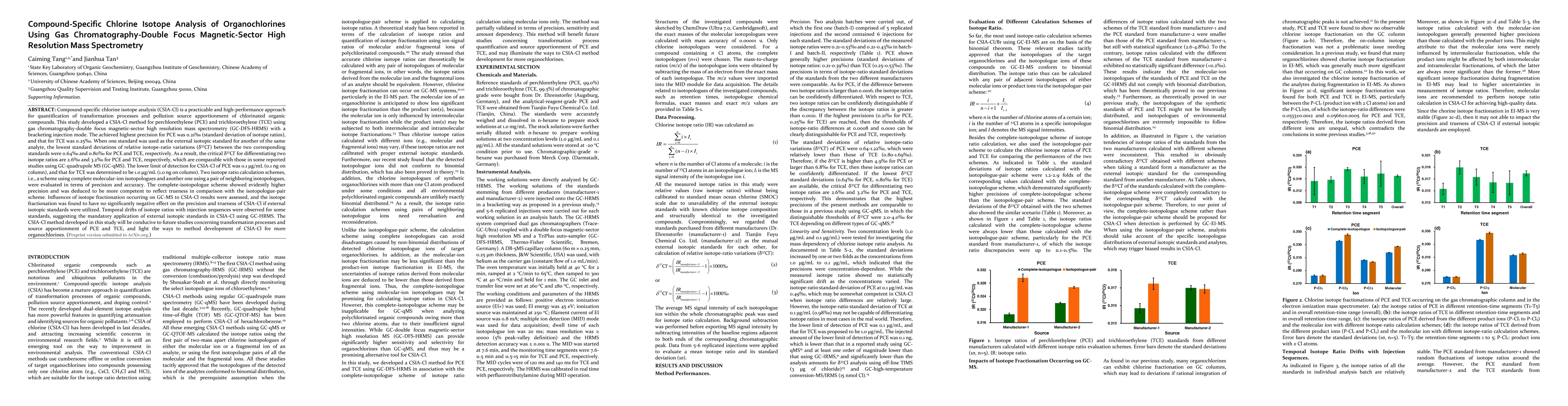 This study developed a compound-specific chlorine isotope analysis (CSIA-Cl) method for perchlorethylene (PCE) and trichloroethylene (TCE) using GC-DFS-HRMS, achieving high precision and low detection limits. The complete-molecular-ion isotopologue scheme demonstrated superior precision and accuracy for isotope ratio calculations.