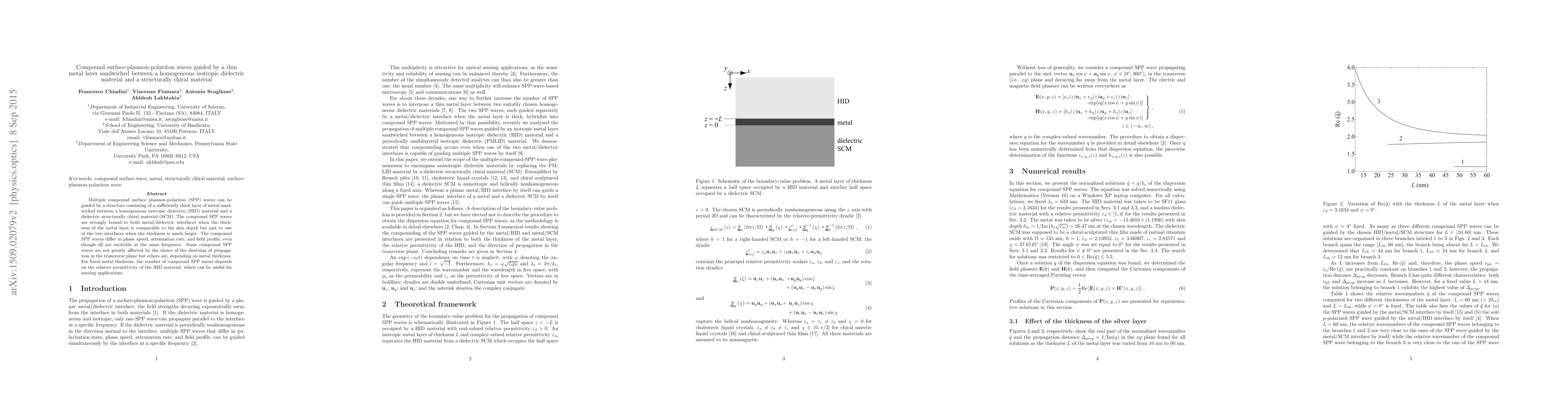 This paper investigates compound surface plasmon-polariton (SPP) waves guided by a metal layer between a dielectric and a chiral material. It finds that the number and characteristics of these waves, including phase speed and attenuation, depend on metal thickness and relative permittivity of the dielectric, with implications for sensing applications.