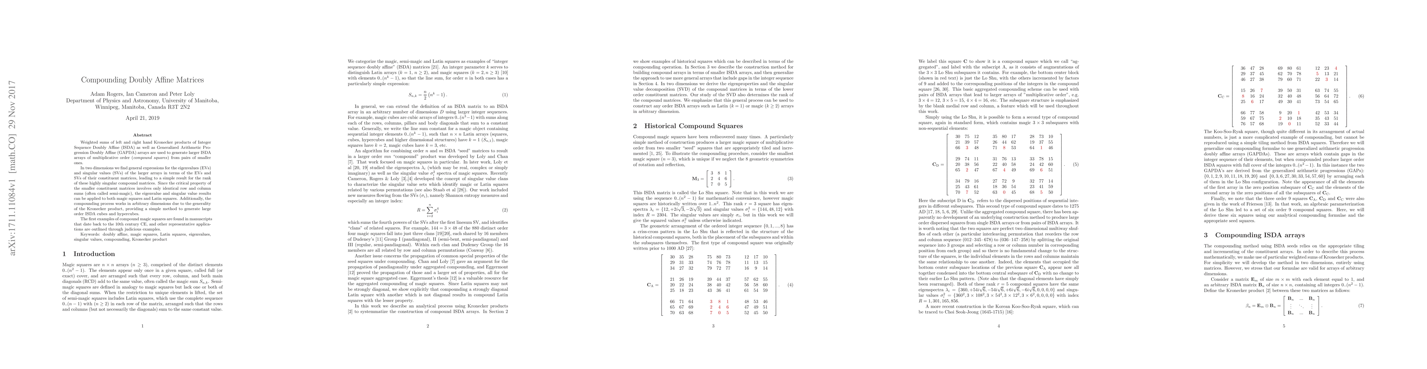 Weighted sums of left and right hand Kronecker products of Integer Sequence Doubly Affine (ISDA) as well as Generalized Arithmetic Progression Doubly Affine (GAPDA) arrays are used to generate larger ISDA arrays of multiplicative order (compound squares) from pairs of smaller ones. In two dimensions we find general expressions for the eigenvalues (EVs) and singular values (SVs) of the larger arrays in terms of the EVs and SVs of their constituent matrices, leading to a simple result for the rank of these highly singular compound matrices. Since the critical property of the smaller constituent matrices involves only identical row and column sums (often called semi-magic), the eigenvalue and singular value results can be applied to both magic squares and Latin squares. Additionally, the compounding process works in arbitrary dimensions due to the generality of the Kronecker product, providing a simple method to generate large order ISDA cubes and hypercubes. The first examples of compound magic squares are found in manuscripts that date back to the 10th century CE, and other representative applications are outlined through judicious examples.
