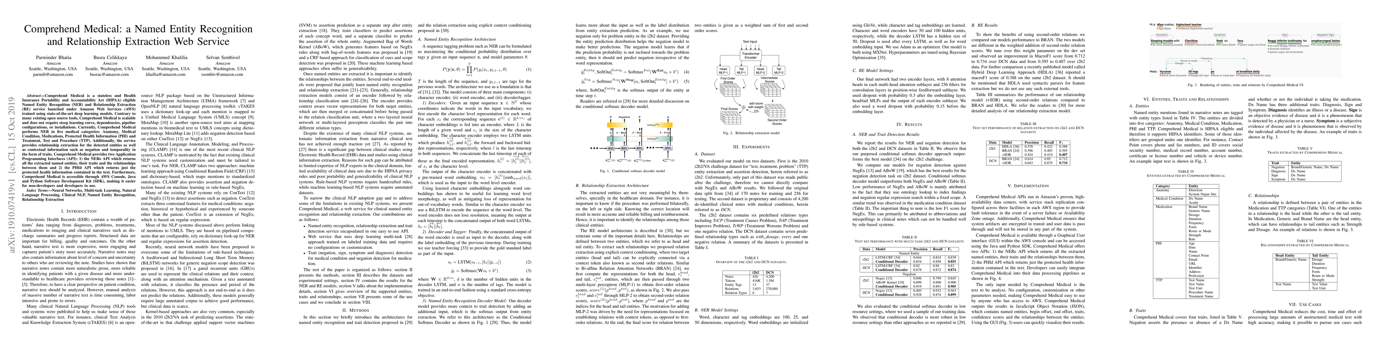 Comprehend Medical is a stateless and Health Insurance Portability and Accountability Act (HIPAA) eligible Named Entity Recognition (NER) and Relationship Extraction (RE) service launched under Amazon Web Services (AWS) trained using state-of-the-art deep learning models. Contrary to many existing open source tools, Comprehend Medical is scalable and does not require steep learning curve, dependencies, pipeline configurations, or installations. Currently, Comprehend Medical performs NER in five medical categories: Anatomy, Medical Condition, Medications, Protected Health Information (PHI) and Treatment, Test and Procedure (TTP). Additionally, the service provides relationship extraction for the detected entities as well as contextual information such as negation and temporality in the form of traits. Comprehend Medical provides two Application Programming Interfaces (API): 1) the NERe API which returns all the extracted named entities, their traits and the relationships between them and 2) the PHId API which returns just the protected health information contained in the text. Furthermore, Comprehend Medical is accessible through AWS Console, Java and Python Software Development Kit (SDK), making it easier for non-developers and developers to use.