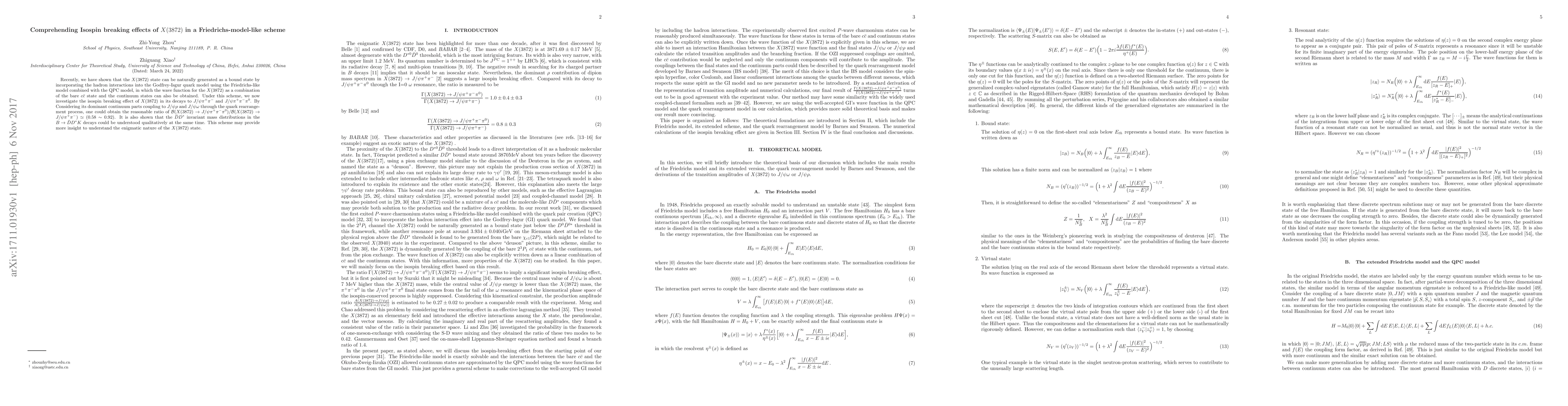 Recently, we have shown that the $X(3872)$ state can be naturally generated as a bound state by incorporating the hadron interactions into the Godfrey-Isgur quark model using the Friedrichs-like model combined with the QPC model, in which the wave function for the $X(3872)$ as a combination of the bare $c\bar c$ state and the continuum states can also be obtained. Under this scheme, we now investigate the isospin breaking effect of $X(3872)$ in its decays to $J/\psi\pi^+\pi^-$ and $J/\psi\pi^+\pi^-\pi^0$. By Considering its dominant continuum parts coupling to $J/\psi\rho$ and $J/\psi\omega$ through the quark rearrangement process, one could obtain the reasonable ratio of $\mathcal{B}(X(3872)\rightarrow J/\psi\pi^+\pi^-\pi^0)/\mathcal{B}(X(3872)\rightarrow J/\psi\pi^+\pi^-)\simeq (0.58\sim 0.92)$. It is also shown that the $\bar D D^*$ invariant mass distributions in the $B\rightarrow \bar D D^* K$ decays could be understood qualitatively at the same time. This scheme may provide more insight to understand the enigmatic nature of the $X(3872)$ state.