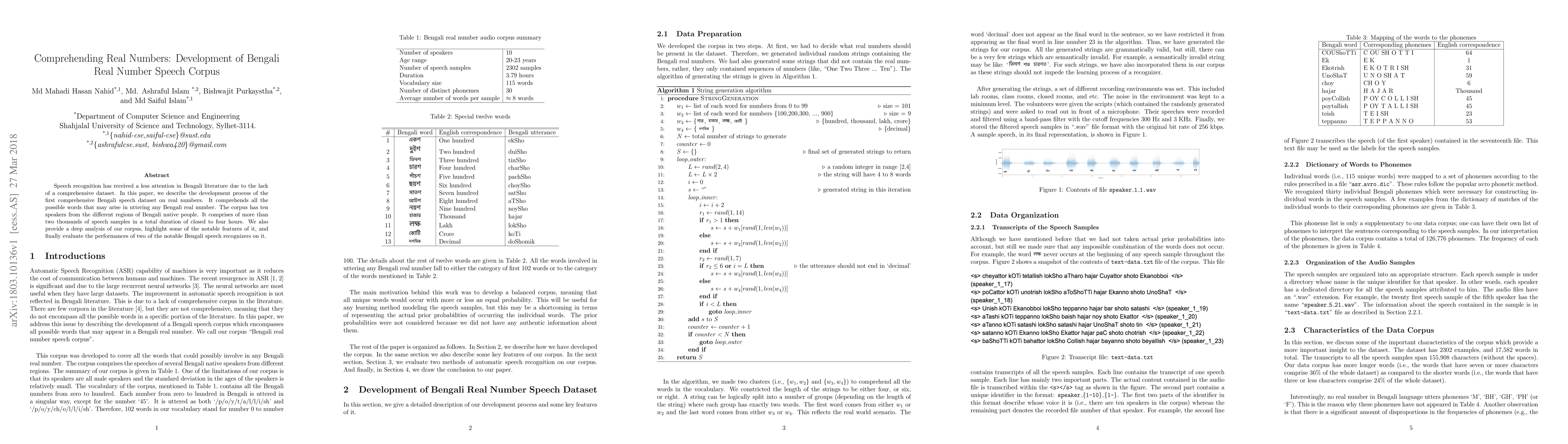 Speech recognition has received a less attention in Bengali literature due to the lack of a comprehensive dataset. In this paper, we describe the development process of the first comprehensive Bengali speech dataset on real numbers. It comprehends all the possible words that may arise in uttering any Bengali real number. The corpus has ten speakers from the different regions of Bengali native people. It comprises of more than two thousands of speech samples in a total duration of closed to four hours. We also provide a deep analysis of our corpus, highlight some of the notable features of it, and finally evaluate the performances of two of the notable Bengali speech recognizers on it.