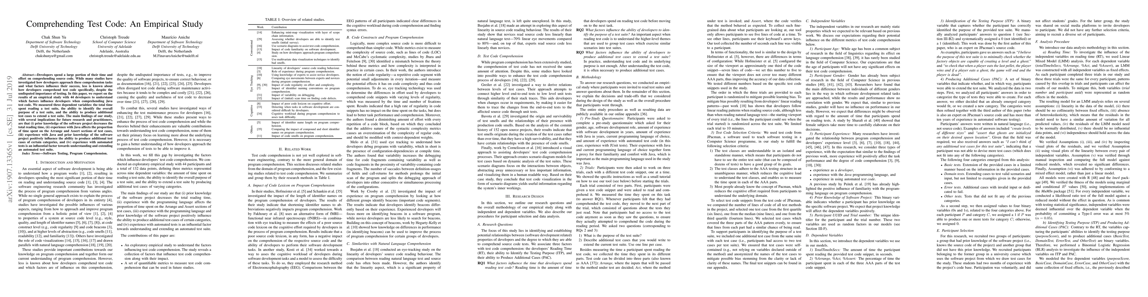 This study investigates factors influencing developers' comprehension of Java test code through an empirical study with 44 participants. Key findings include reduced reading time with prior project knowledge and experience with Java affecting test case sections, while experience with automated tests aids in understanding and extending test suites.