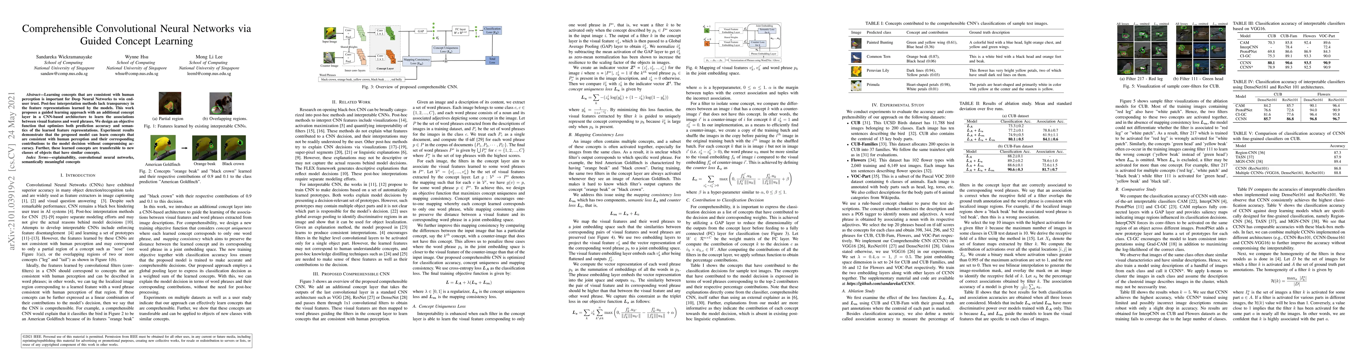 Learning concepts that are consistent with human perception is important for Deep Neural Networks to win end-user trust. Post-hoc interpretation methods lack transparency in the feature representations learned by the models. This work proposes a guided learning approach with an additional concept layer in a CNN- based architecture to learn the associations between visual features and word phrases. We design an objective function that optimizes both prediction accuracy and semantics of the learned feature representations. Experiment results demonstrate that the proposed model can learn concepts that are consistent with human perception and their corresponding contributions to the model decision without compromising accuracy. Further, these learned concepts are transferable to new classes of objects that have similar concepts.