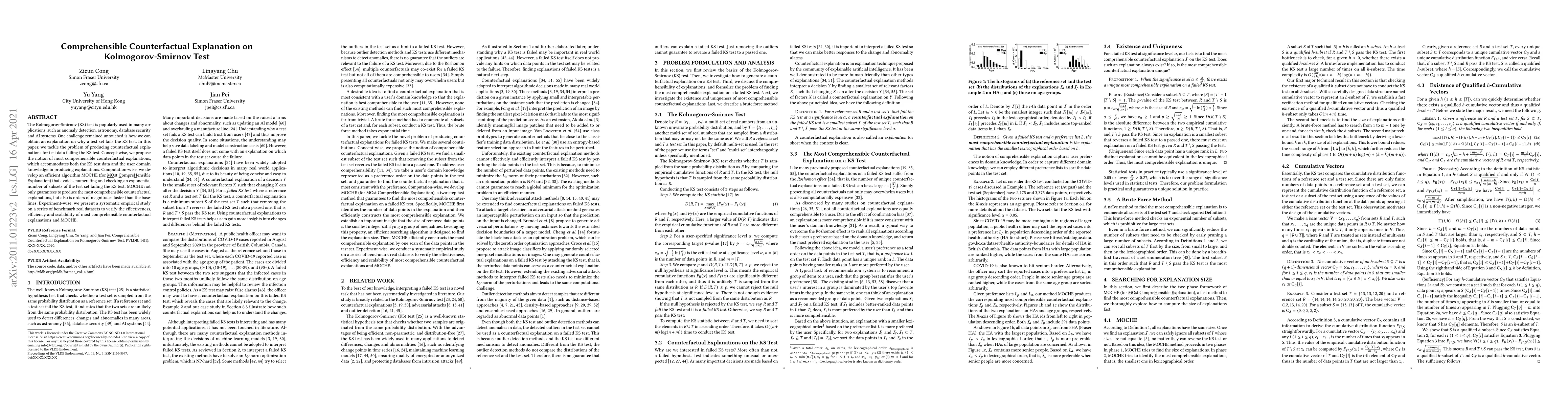 This paper introduces a method for generating comprehensible counterfactual explanations for test data failing the Kolmogorov-Smirnov (KS) test, proposing the concept of most comprehensible counterfactual explanations and an efficient algorithm MOCHE to achieve this. The study demonstrates the effectiveness and scalability of the approach through empirical evaluations on real datasets.