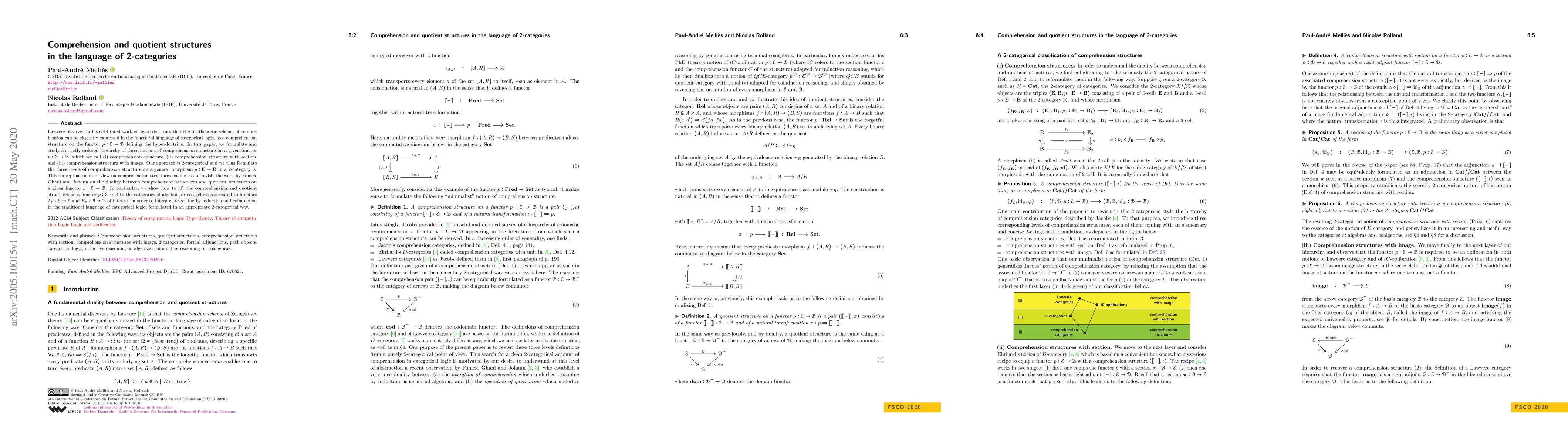Lawvere observed in his celebrated work on hyperdoctrines that the set-theoretic schema of comprehension can be elegantly expressed in the functorial language of categorical logic, as a comprehension structure on the functor $p:\mathscr{E}\to\mathscr{B}$ defining the hyperdoctrine. In this paper, we formulate and study a strictly ordered hierarchy of three notions of comprehension structure on a given functor $p:\mathscr{E}\to\mathscr{B}$, which we call (i) comprehension structure, (ii) comprehension structure with section, and (iii) comprehension structure with image. Our approach is 2-categorical and we thus formulate the three levels of comprehension structure on a general morphism $p:\mathrm{\mathbf{E}}\to\mathrm{\mathbf{B}}$ in a 2-category $\mathscr{K}$. This conceptual point of view on comprehension structures enables us to revisit the work by Fumex, Ghani and Johann on the duality between comprehension structures and quotient structures on a given functor $p:\mathscr{E}\to\mathscr{B}$. In particular, we show how to lift the comprehension and quotient structures on a functor $p:\mathscr{E}\to\mathscr{B}$ to the categories of algebras or coalgebras associated to functors $F_{\mathscr{E}}:\mathscr{E}\to\mathscr{E}$ and $F_{\mathscr{B}}:\mathscr{B}\to\mathscr{B}$ of interest, in order to interpret reasoning by induction and coinduction in the traditional language of categorical logic, formulated in an appropriate 2-categorical way.