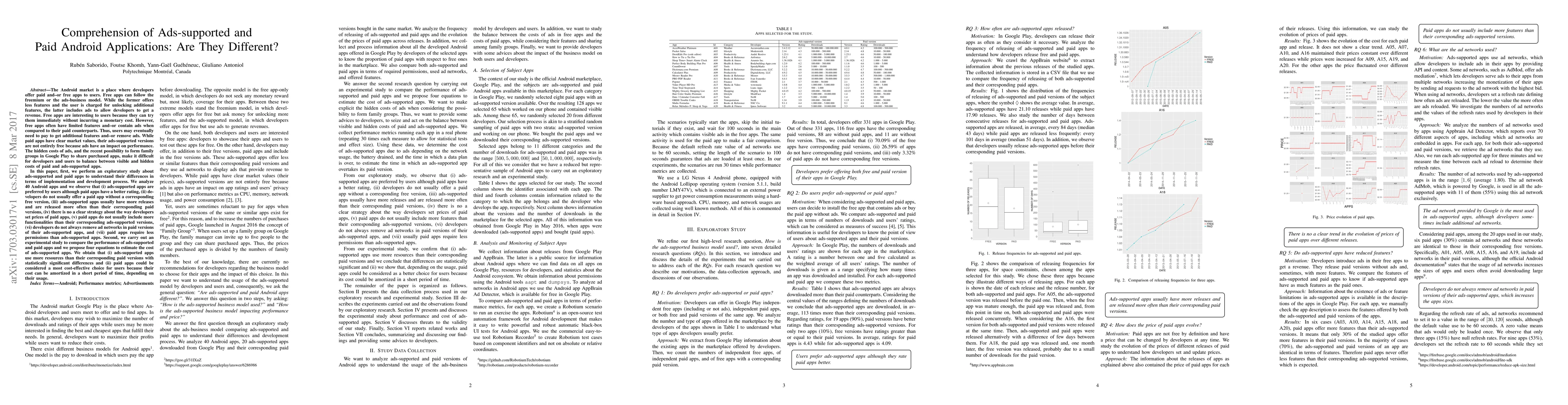 This paper explores the differences between ads-supported and paid Android applications, finding that ads-supported apps are preferred by users despite paid apps having better ratings. An experimental study reveals that ads-supported apps use more resources and are more costly, while paid apps are more cost-effective over time.