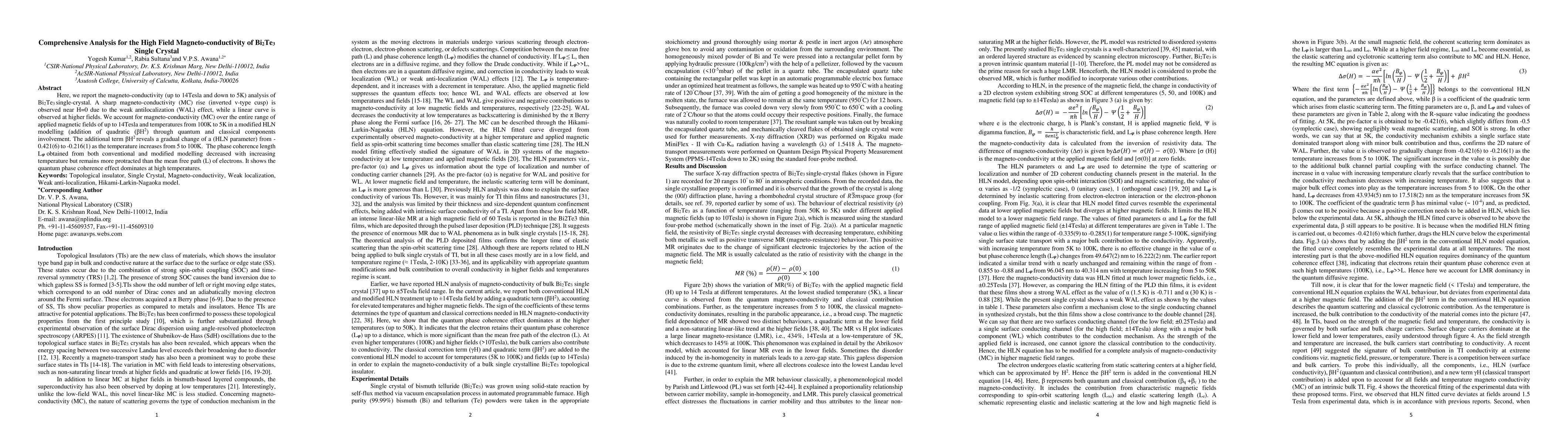Researchers analyzed Bi2Te3 single crystals under high magnetic fields to 14Tesla and temperatures from 5K to 100K, revealing a sharp magneto-conductivity rise near zero field due to weak antilocalization, with quantum effects dominating at higher temperatures.