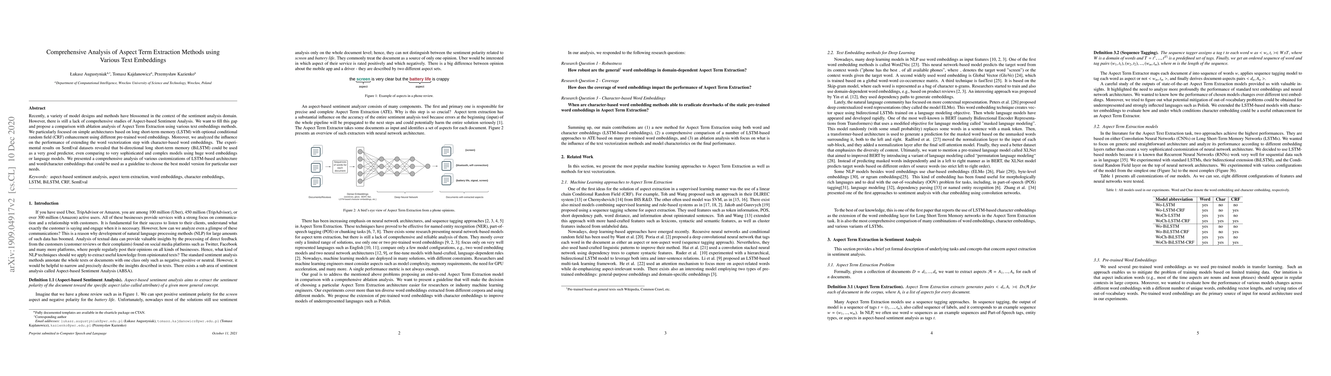 Recently, a variety of model designs and methods have blossomed in the context of the sentiment analysis domain. However, there is still a lack of wide and comprehensive studies of aspect-based sentiment analysis (ABSA). We want to fill this gap and propose a comparison with ablation analysis of aspect term extraction using various text embedding methods. We particularly focused on architectures based on long short-term memory (LSTM) with optional conditional random field (CRF) enhancement using different pre-trained word embeddings. Moreover, we analyzed the influence on the performance of extending the word vectorization step with character embedding. The experimental results on SemEval datasets revealed that not only does bi-directional long short-term memory (BiLSTM) outperform regular LSTM, but also word embedding coverage and its source highly affect aspect detection performance. An additional CRF layer consistently improves the results as well.