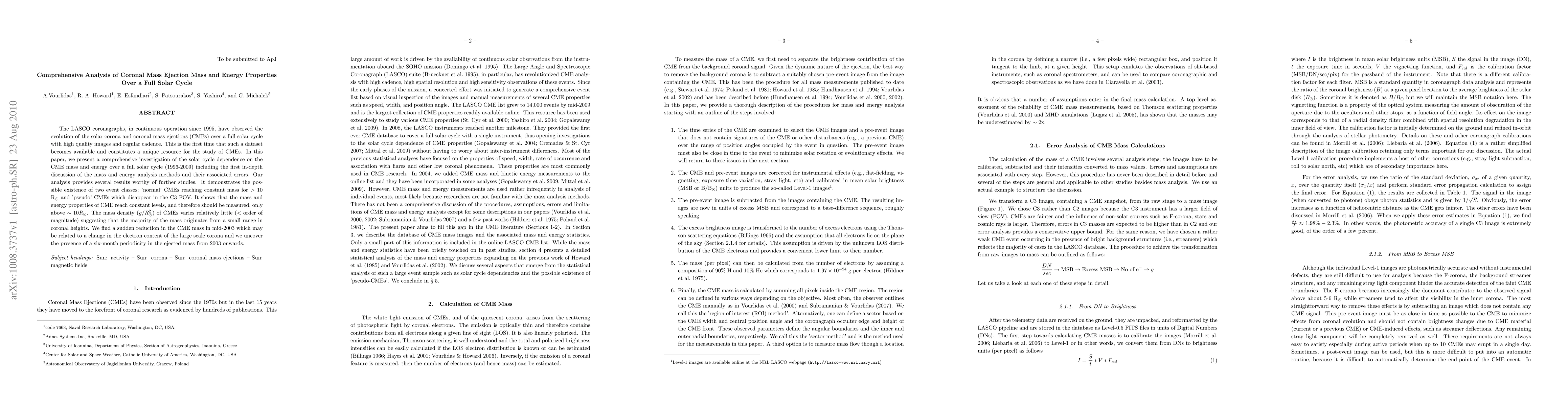 The LASCO coronagraphs, in continuous operation since 1995, have observed the evolution of the solar corona and coronal mass ejections (CMEs) over a full solar cycle with high quality images and regular cadence. This is the first time that such a dataset becomes available and constitutes a unique resource for the study of CMEs. In this paper, we present a comprehensive investigation of the solar cycle dependence on the CME mass and energy over a full solar cycle (1996-2009) including the first in-depth discussion of the mass and energy analysis methods and their associated errors. Our analysis provides several results worthy of further studies. It demonstrates the possible existence of two event classes; 'normal' CMEs reaching constant mass for $>10$ R$_{\sun}$ and 'pseudo' CMEs which disappear in the C3 FOV. It shows that the mass and energy properties of CME reach constant levels, and therefore should be measured, only above $\sim 10 R_\sun$. The mass density ($g/R_\sun^2$) of CMEs varies relatively little ($<$ order of magnitude) suggesting that the majority of the mass originates from a small range in coronal heights. We find a sudden reduction in the CME mass in mid-2003 which may be related to a change in the electron content of the large scale corona and we uncover the presence of a six-month periodicity in the ejected mass from 2003 onwards.