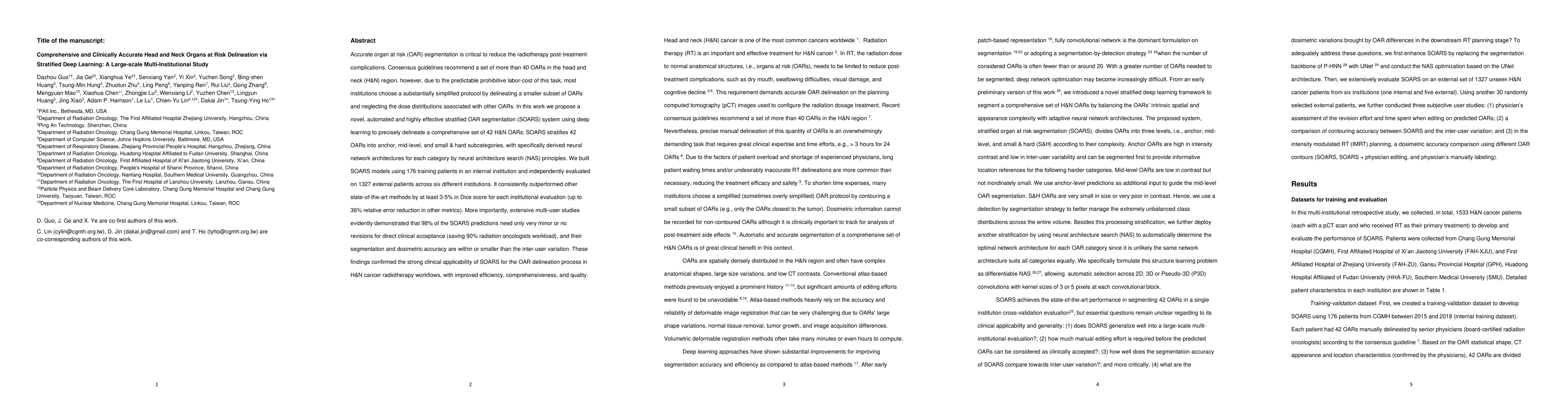 Accurate organ at risk (OAR) segmentation is critical to reduce the radiotherapy post-treatment complications. Consensus guidelines recommend a set of more than 40 OARs in the head and neck (H&N) region, however, due to the predictable prohibitive labor-cost of this task, most institutions choose a substantially simplified protocol by delineating a smaller subset of OARs and neglecting the dose distributions associated with other OARs. In this work we propose a novel, automated and highly effective stratified OAR segmentation (SOARS) system using deep learning to precisely delineate a comprehensive set of 42 H&N OARs. SOARS stratifies 42 OARs into anchor, mid-level, and small & hard subcategories, with specifically derived neural network architectures for each category by neural architecture search (NAS) principles. We built SOARS models using 176 training patients in an internal institution and independently evaluated on 1327 external patients across six different institutions. It consistently outperformed other state-of-the-art methods by at least 3-5% in Dice score for each institutional evaluation (up to 36% relative error reduction in other metrics). More importantly, extensive multi-user studies evidently demonstrated that 98% of the SOARS predictions need only very minor or no revisions for direct clinical acceptance (saving 90% radiation oncologists workload), and their segmentation and dosimetric accuracy are within or smaller than the inter-user variation. These findings confirmed the strong clinical applicability of SOARS for the OAR delineation process in H&N cancer radiotherapy workflows, with improved efficiency, comprehensiveness, and quality.