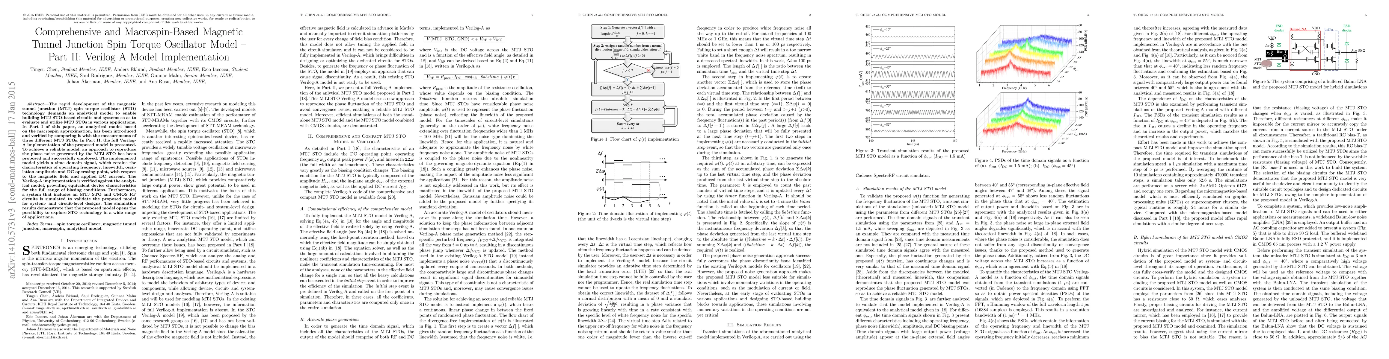 The paper presents a Verilog-A implementation of a macrospin-based magnetic tunnel junction spin torque oscillator (MTJ STO) model, verified against measurements of three different MTJ STOs and an analytical model.